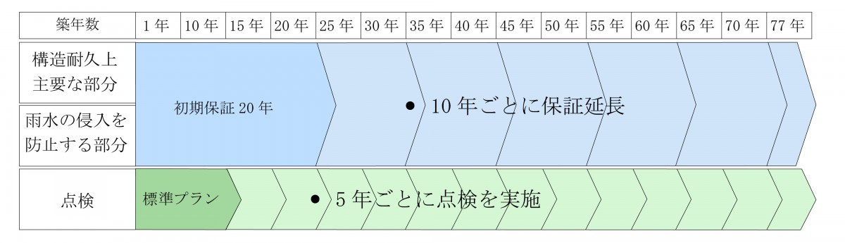 初期保証20年後、有料メンテナンスを経て10年毎に延長保証を追加する事が可能です。(最長77年まで)