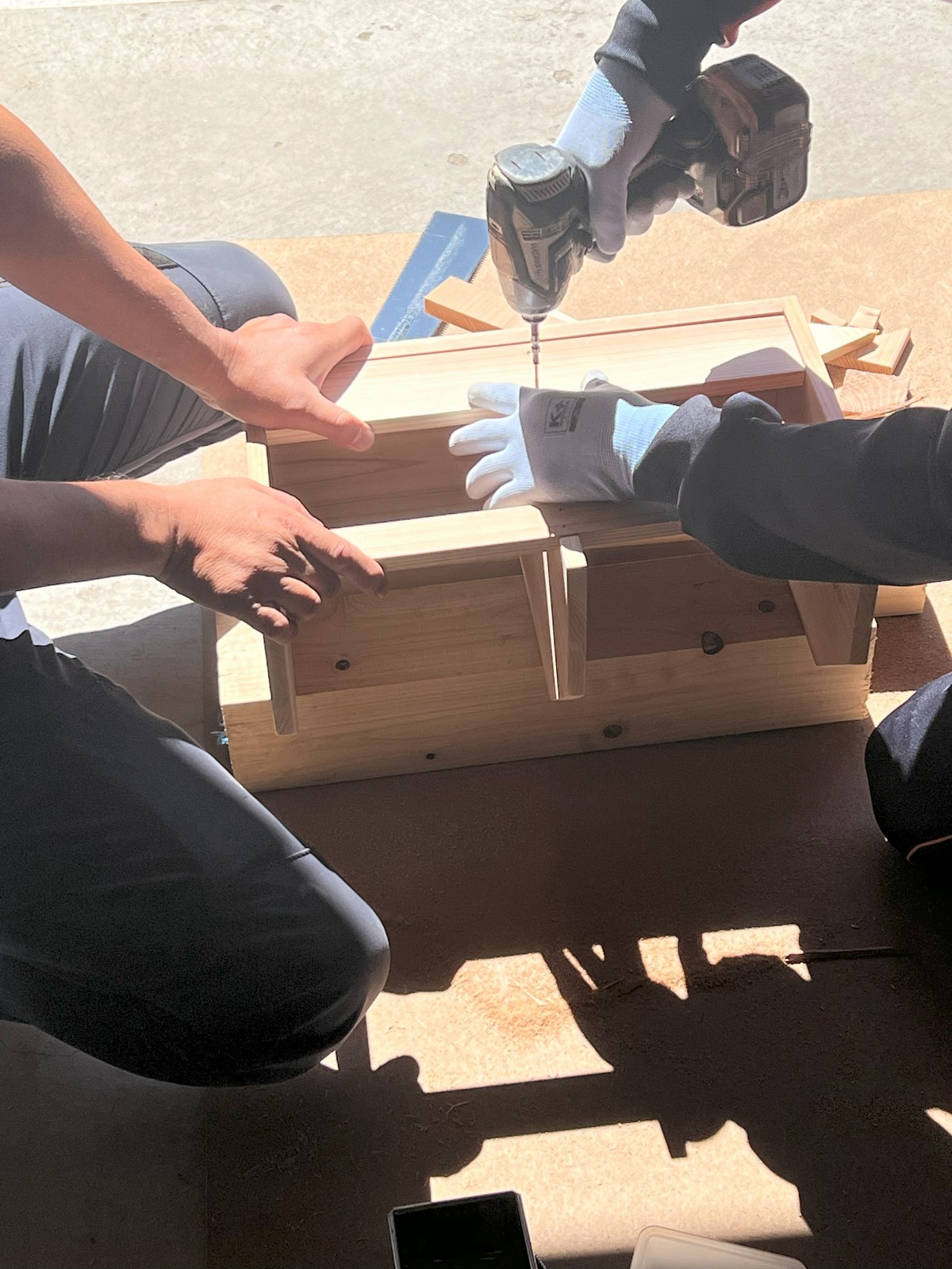 のこぎりによる木材のカット、紙やすり掛け、組み立て、塗装、と工程通りに作業を進めていきます。