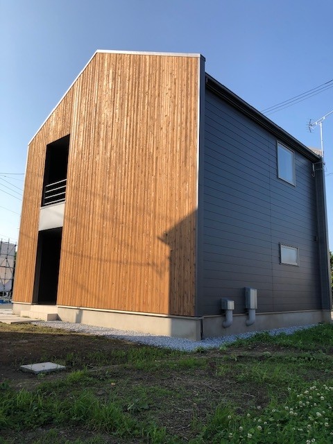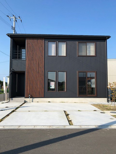 黒の外壁に木のルーバーデザインが映える素敵なデザインです。内装もカッコよく、和とモダンの融合した雰囲気漂う空間です。