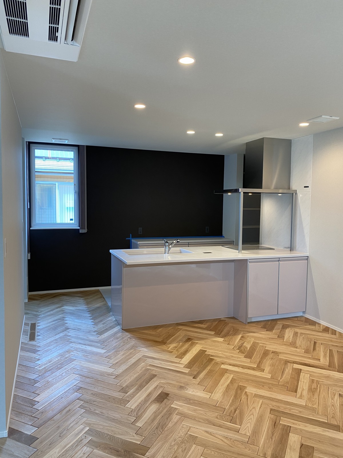 ヘリンボーン柄の床は無垢材を使用しており、木目調がとっても美しいです。