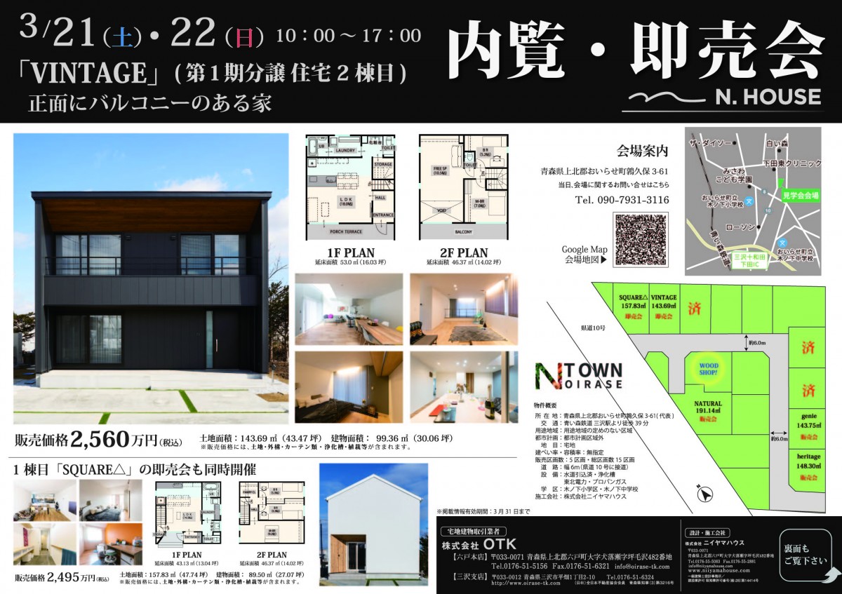 コンテンツ更新情報CONTENTS N.HOUSEの家とは N.HOUSEの家商品ラインナップ Works施工例 土地・分譲住宅中古住宅 家造りの流れ 保証・サポート お客様の声 N.HOUSEの家とは トップページ コンセプト 資材 性能 取得できる公的認定制度 ものづくり 土地・分譲住宅中古住宅 トップページ 土地探し 分譲住宅 中古住宅 保証・サポート トップページ お客様の声 トップページ こだわりポイント ご契約時アンケート 1年過ごした感想 トップページ コンテンツ更新情報 【おいらせ町】3/21・3/22 鶉久保建売分譲地 第2棟目完成見学開催!! 2020.03.04 【おいらせ町】3/21・3/22 鶉久保建売分譲地 第2棟目完成見学開催!! ※こちらのイベントは終了いたしましが随時見学可能となっております。【詳しくはこちら】 おいらせ町鶉久保分譲地 第二棟目 VINTAGE(ヴィンテージ) 建物詳細はこちら 会場案内図 青森県上北郡おいらせ町鶉久保3-60 アプリで開く 一覧へ