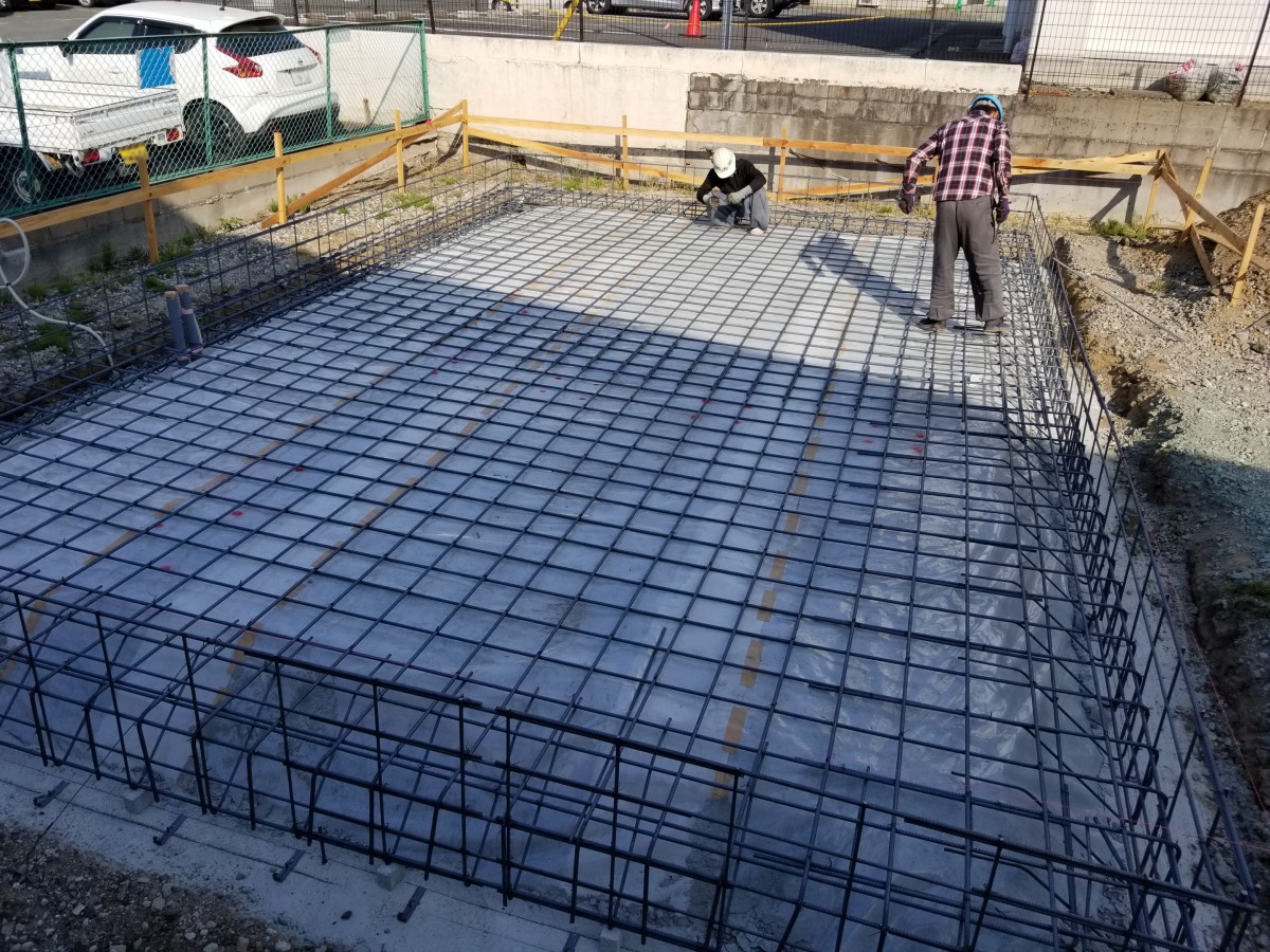 そして、その上に床下の湿気を防ぐ為の防湿シートが敷きこまれ、鉄筋を組み立てている最中でした。