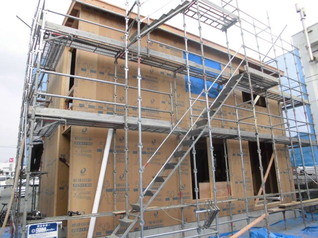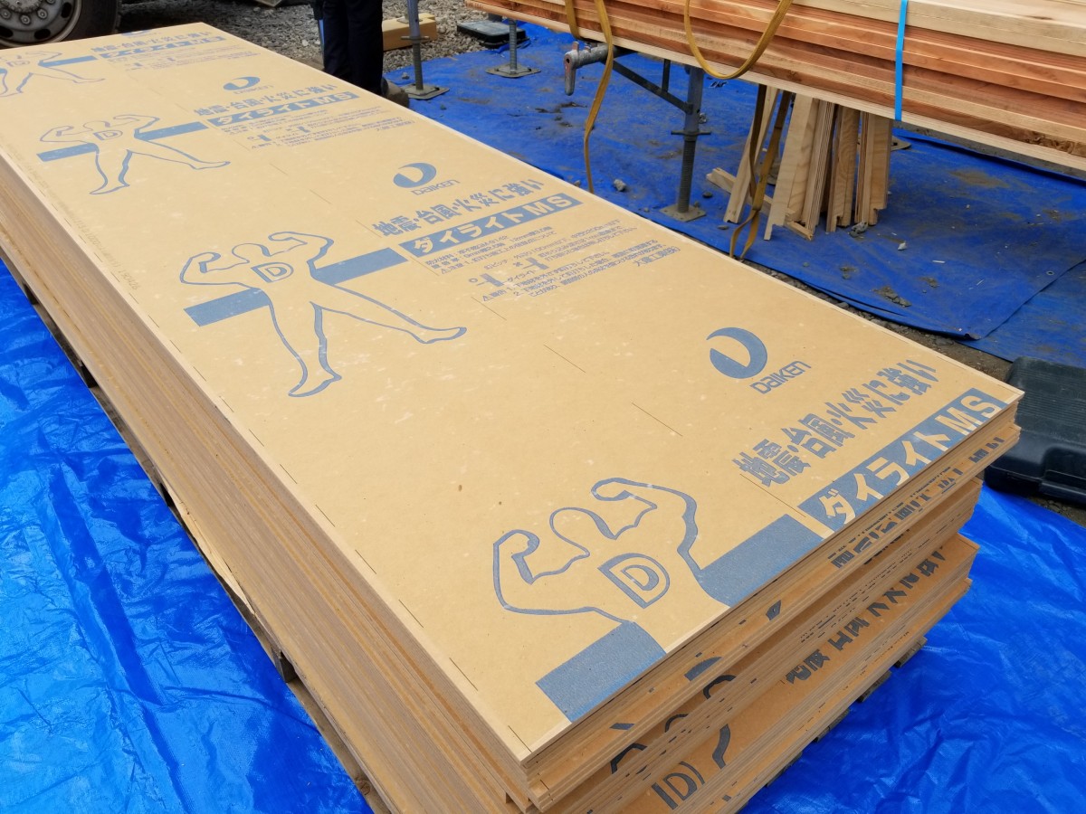現場監督に確認したところ、写真のように「ダイライトMS」を柱に打ち付ける事によって、地震力・風圧力等を受け止め、バランスよく分散させることができ、様々な「外力」に耐えうる強い家ができます。