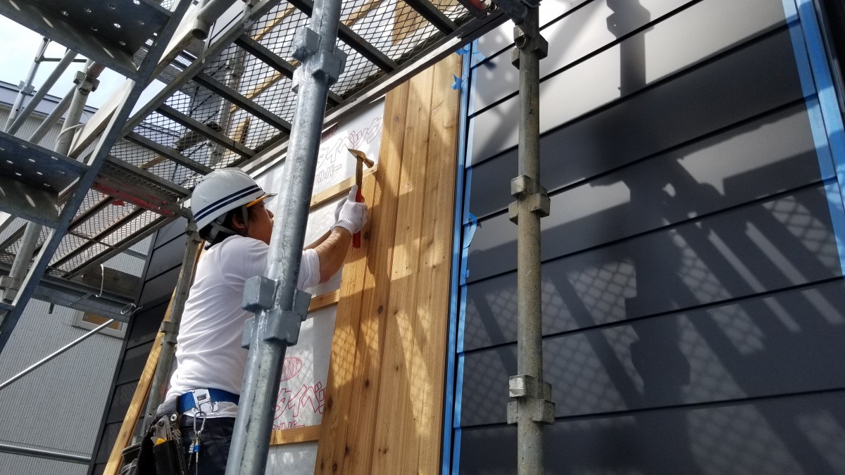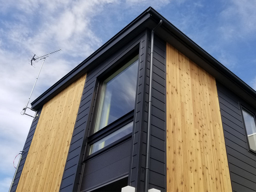 現在建築中のHOMA-SANCTUARYⅡの外壁は金属系サイディングと、木質パネルを使用しています。