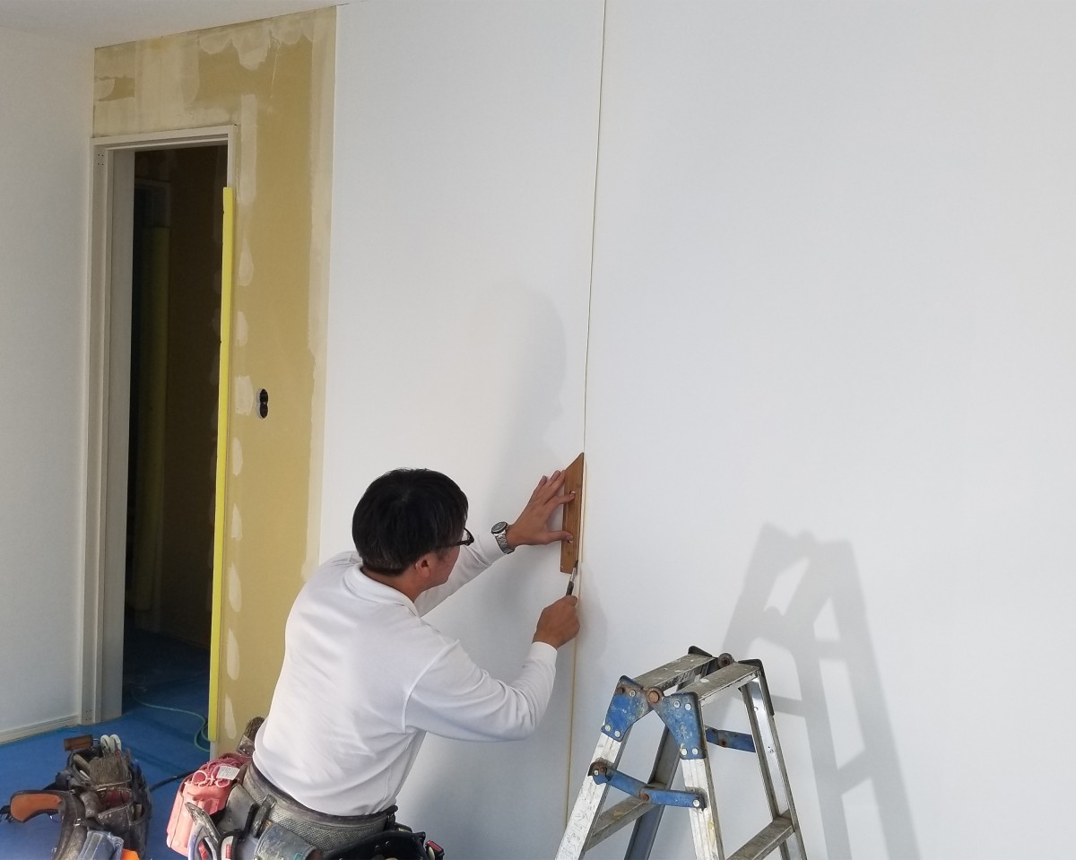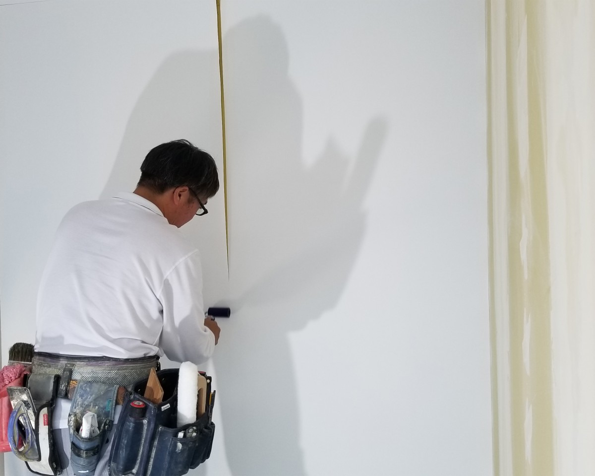 壁紙貼りは壁紙の繋ぎ目がわからないように綺麗にカットし貼り付ける様子は、まさに職人技!