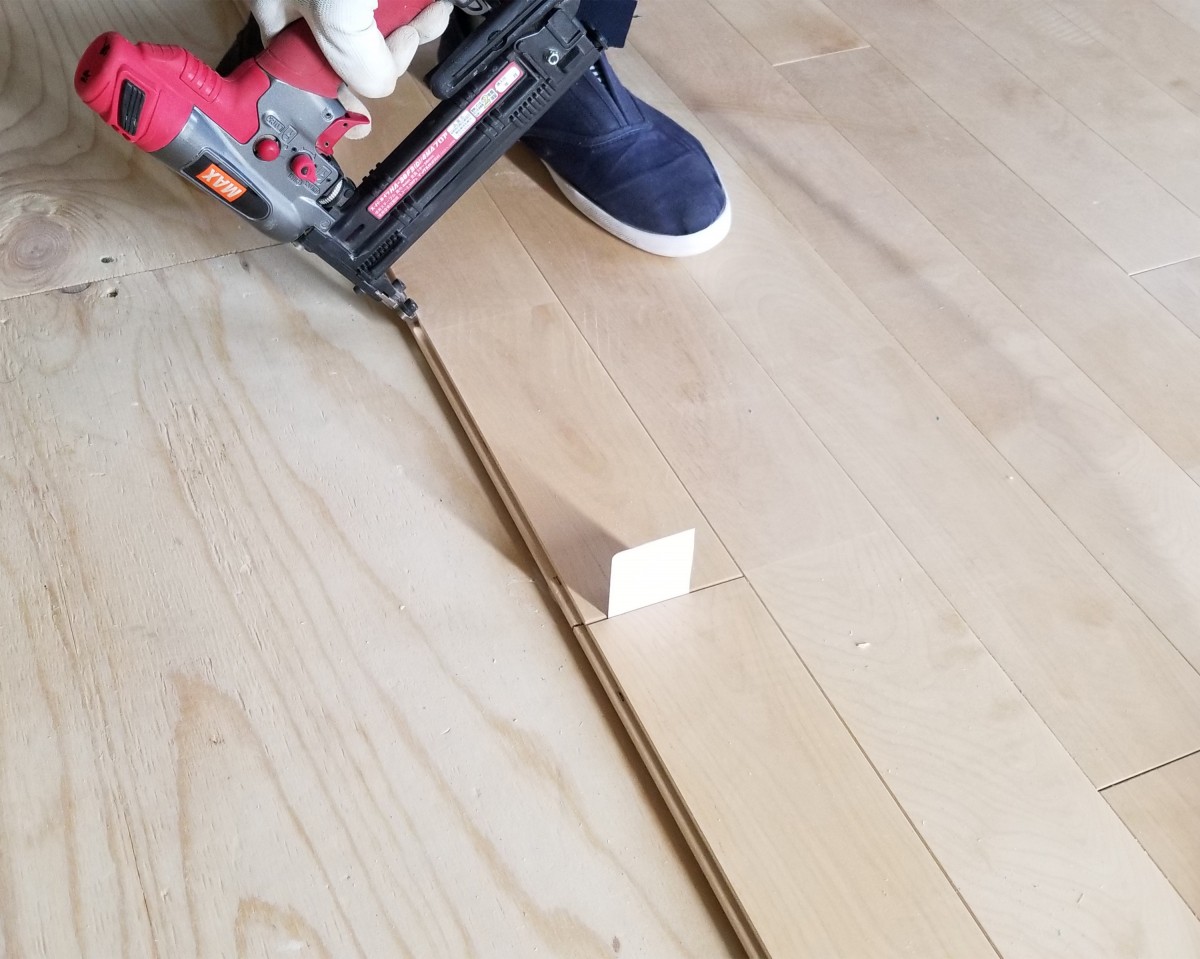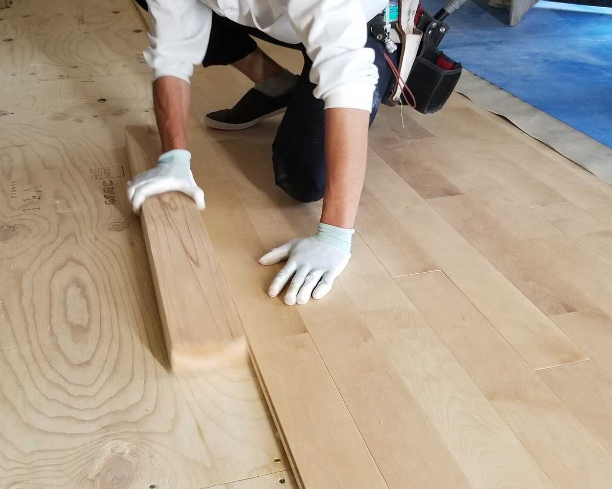 床材の施工では、床材の間に紙を挟みながら施工していました。