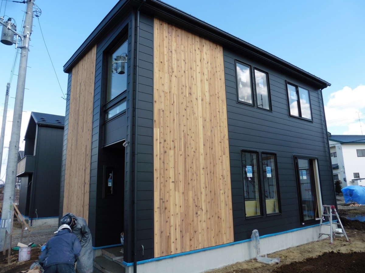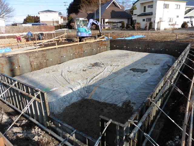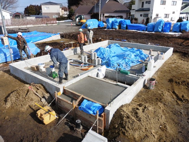 おいらせ町鶉久保分譲地の4棟目が着工しました。今回建築する「foresta(フォレスタ)」は黒い外観で、アクセントに木目の壁が映える人気のプランです。現場では基礎工事の終盤です。基礎の内部を仕切るためのグリッドポストというコンクリートのブロックを設置しています。このグリッドポストの基礎を採用してからはだいぶ基礎工事が早くなりました。少しでも短い工期で、早くお引渡しが出来るようになりました。グリッドポスト基礎の特徴をさらに詳しくはこちらへ【耐震性能:基礎】
