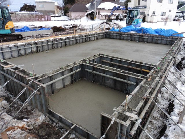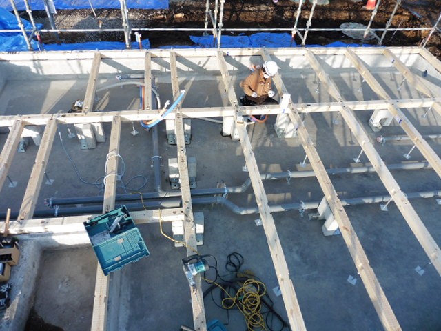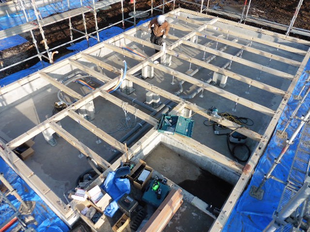 基礎工事が終わりました。弊社で採用している基礎は耐圧盤式グリッドポスト基礎工法で、内部立上りの基礎梁に変わって、工場で作ったコンクリートブロックを設置しています。この工法では内部の仕切りが少なくなるため、床下の空気循環性とメンテナンス性が向上します。その結果、床下環境が良好となるため、住宅の耐久性が向上します。それ以外にも床下の給水・排水管の配管もしやすく、施工する側にも助かります。写真見ても分かるように、内部の仕切りが少ないため通風性が良さそうです。