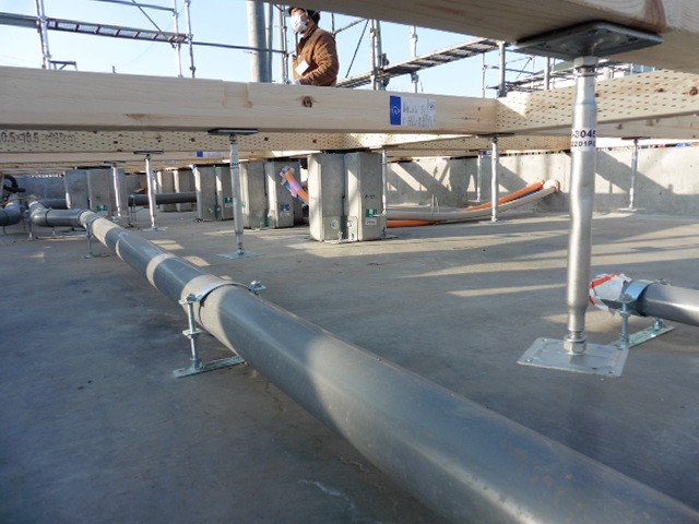 建方が終わり、屋根工事が終わりました。採用している屋根材はガルバリウム鋼板という金属板で、錆びに強く、腐食しにくいのが特徴です。常に雨風にさらされて、直射日光を受け続けている屋根ですから、耐久性が高くなければなりません。その他にも遮熱性能が良く、日射を効率的に反射し、屋根温度の上昇を抑えます。さらに屋根表面に親水性(水になじみやすい性質)を付与してますので、降雨時や清掃時に汚れが流れ落ちやすくなります。職人さんも慣れた手つきで屋根材を貼っていきます。気づくとあっという間に屋根が貼り終わってしまいます。いつも高いところでの作業お疲れ様です。