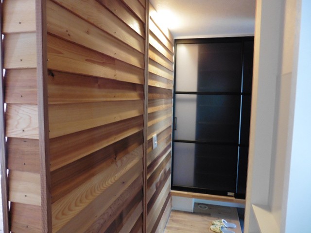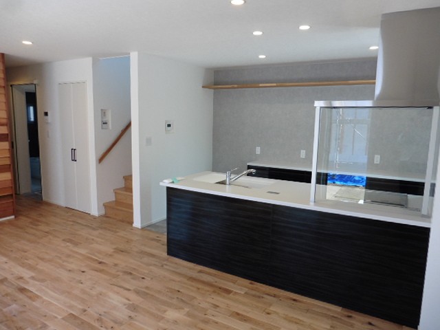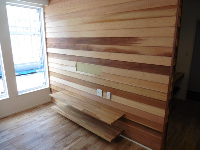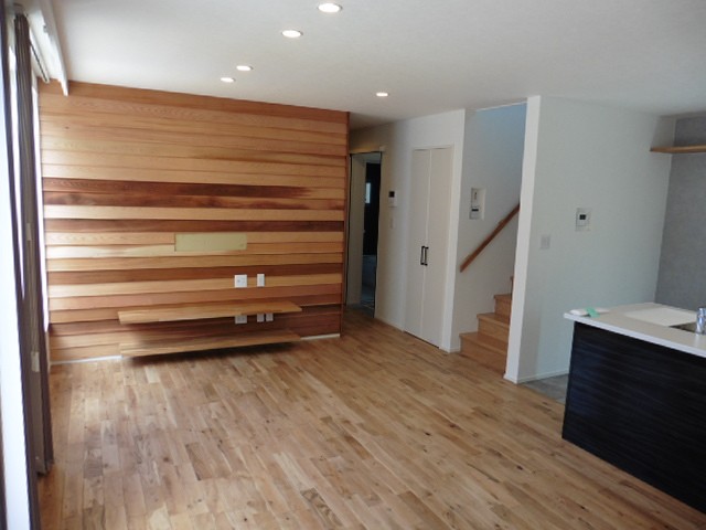 N TOWNの4棟目が完成しました。黒い外装にアクセントで木目の外壁が映えるforesta(フォレスタ)です。フォレスタ(森)という名前を使っているとおり、内装でもいたるところで木材が使用されています。玄関を入ってまず大きなウッドパネルの壁がお出迎え。そしてリビングにも壁一面のウッドパネルにすっきりとした2枚板のテレビ台。キッチンには収納しても良し、飾り棚としも使えそうな大きな1枚板の棚。リビングの床は木目の綺麗な無垢の床材。あちらこちらの木目が気持ちを落ち着かせてくれます。まさに森にいて、深呼吸したくなるような空間です。