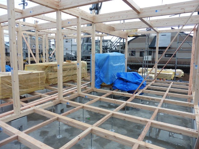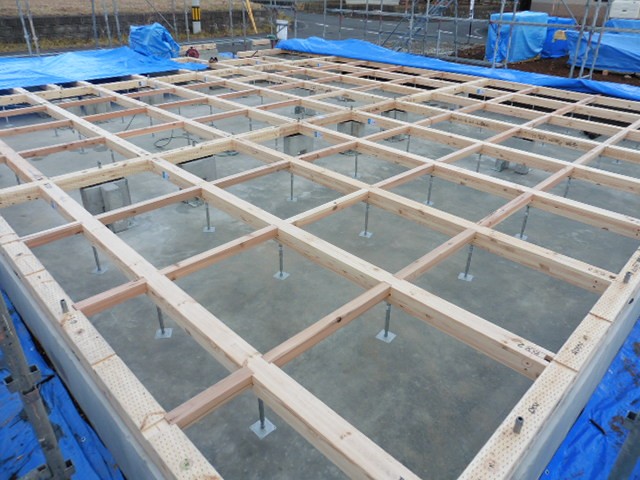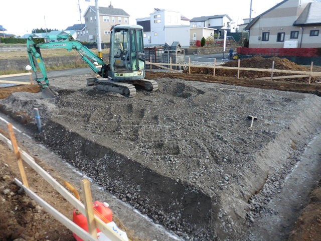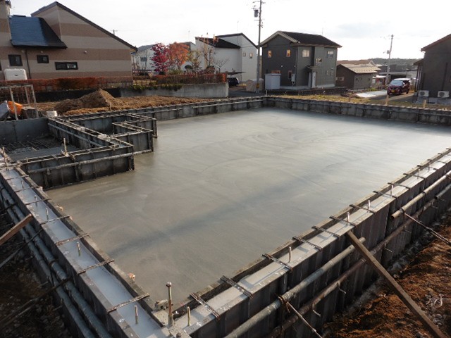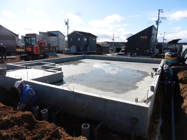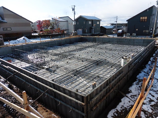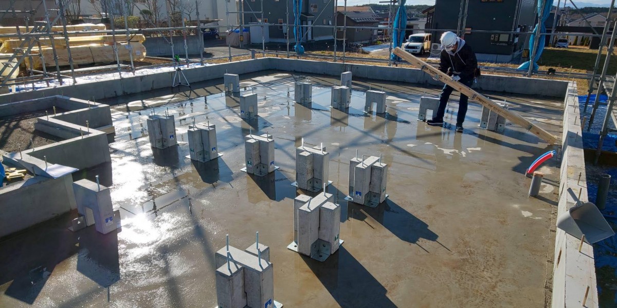 六戸町で着工したのはヘリテージの平屋です。黒を基調とした外観に木格子が際立つデザインです。現場は基礎工事が終わりました。当社の基礎は内部の立ち上がり基礎の代わりに、コンクリートのブロックを設置するグリッドポスト基礎工法です。床下の仕切りが少ないので、メンテナンスも容易です。基礎工事にかかる期間も短縮で出来、コスト削減にもつながります。グリッドポスト基礎工法についてさらにくわしくはことらへ【耐圧盤式グリッドポスト基礎工法】