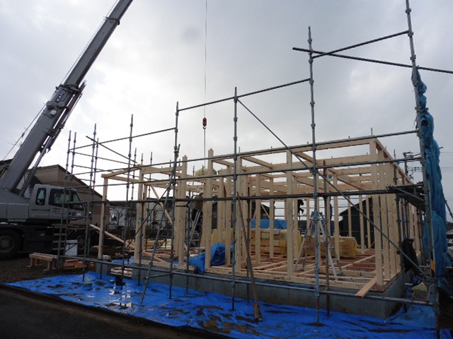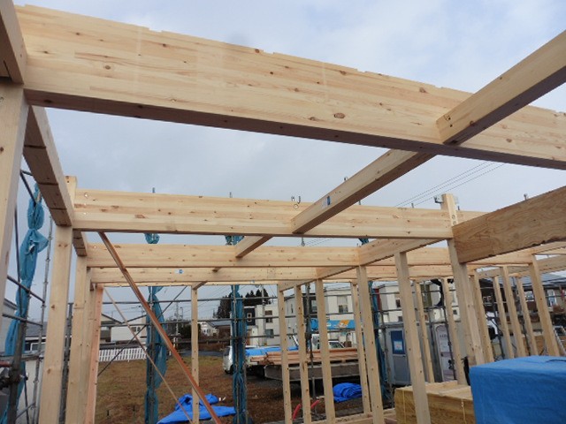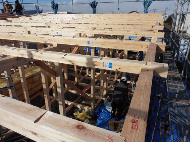 天井下地組が終わりました。完成すると見えなくなりますが、天井裏には綺麗な格子状に木材が組まれています。これは天井のボードを貼るための下地となり、天井の高さを一定に保つためには必要なものです。でも作業の方は組む木材の数が多くて、しかも常に頭の上での作業になるため、腕が疲れそうで大変です。でも仕上がってみると、綺麗な格子が出来上がります。天井裏に隠すにはもったいないくらいですね。