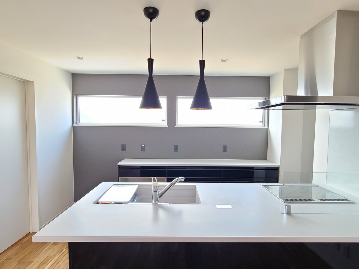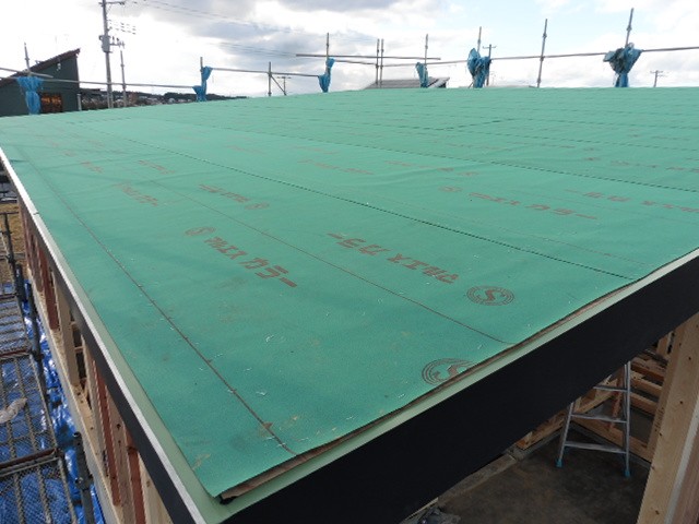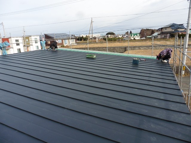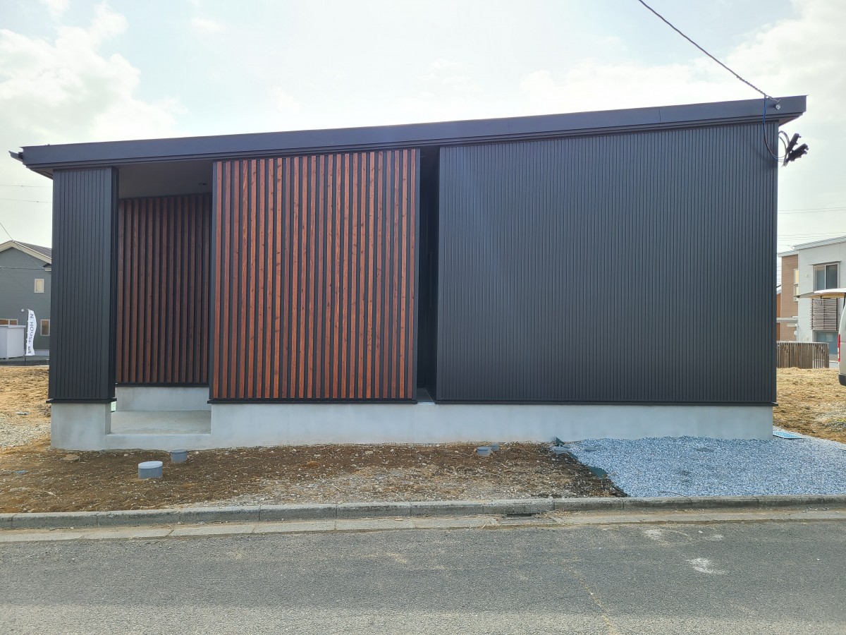 外壁工事が終わりました。この「heritage(ヘリテージ)」は金属の黒いシンプルな外壁です。金属=さびるというイメージがあると思いますが、採用している外壁は、さびに強いガルバ鋼板を使用しています。さらに表面には耐候性・耐久性の高いフッ素樹脂塗装がしてあるので、紫外線による色あせも少ないので、メンテナンスも少なくて済みます。建物の側面は屋根の勾配により、外壁の長さが1枚1枚変わるのので、その都度長さを測って、外壁をその長さにカットして張っていきます。よって、長さを測る人、カットする人、外壁を張る人と、うまく連携がとれていないと、仕事がはかどりません。現場では「次〇〇センチー!」という声が飛び交い、職人さんが手際よく張っていきます。寒い中お疲れ様でした。