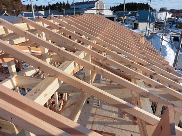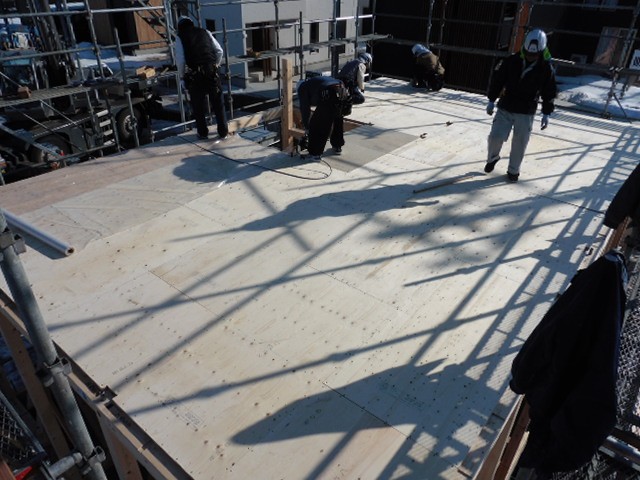 屋根工事が終わりました。この「luce(ルーチェ)」の屋根はアスファルトシングル葺きの屋根です。弊社では金属の屋根を多く使っていますが、このプランは外観デザインを熟慮し、アスファルトシングルの屋根を採用しています。アスファルトシングルはガラス繊維(グラスファイバー)の基材に砂粒で表面を着色しています。硬いゴムのような素材で、表面はゴツゴツしています。基材の主成分は良質のアスファルトですので基本的に水を吸い込むことがありませんので、優れた防水性を発揮します。約1mの細長い屋根材を屋根の低い方から重ねて貼っていきます。金属の屋根であれば半日ぐらいで貼ってしますのですが、このアスファルトシングル屋根は枚数が多いので2日がかりで貼っていきます。総数約400枚以上の屋根材をひたすら貼っていきます。屋根の上なので、風邪を遮るものがないので、とても寒いです。寒い中お疲れ様でした。