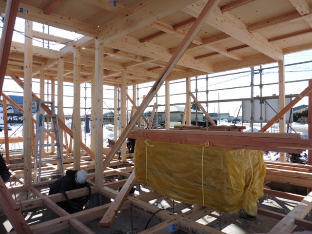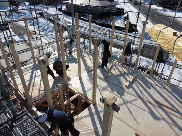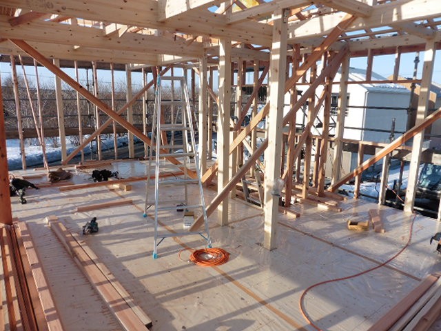 外壁張りが終わりました。外壁は真っ白な金属の外壁です。「luce(ルーチェ)」という名前の意味となっている、光、輝きを印象付ける、光沢のある外壁です。外壁張りをしたこの日は湿った雪がちらつくとても寒い1日でした。1階から2階の屋根まで届く、およそ5.5mの外壁を、傷を付けないように慎重に、慎重に運びます。とても気を使う作業です。手際がいいので、次々と張られて行き、あっという間に側面が終わりです。寒い中お疲れ様でした。