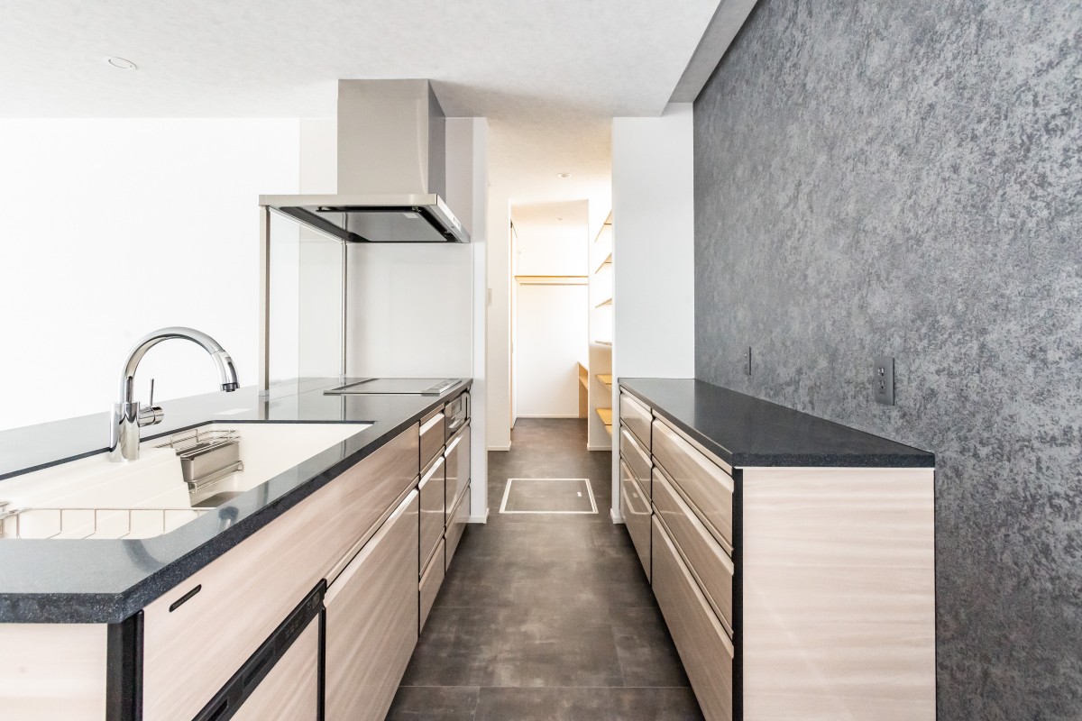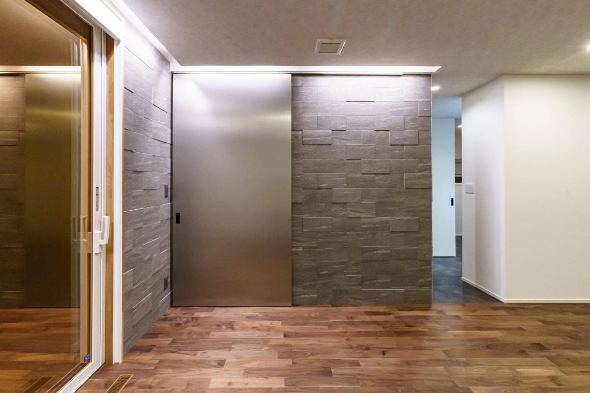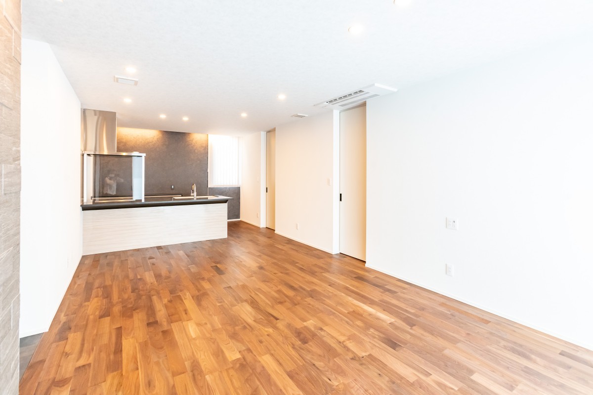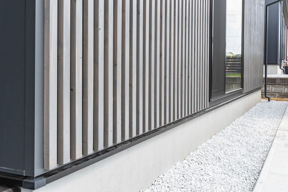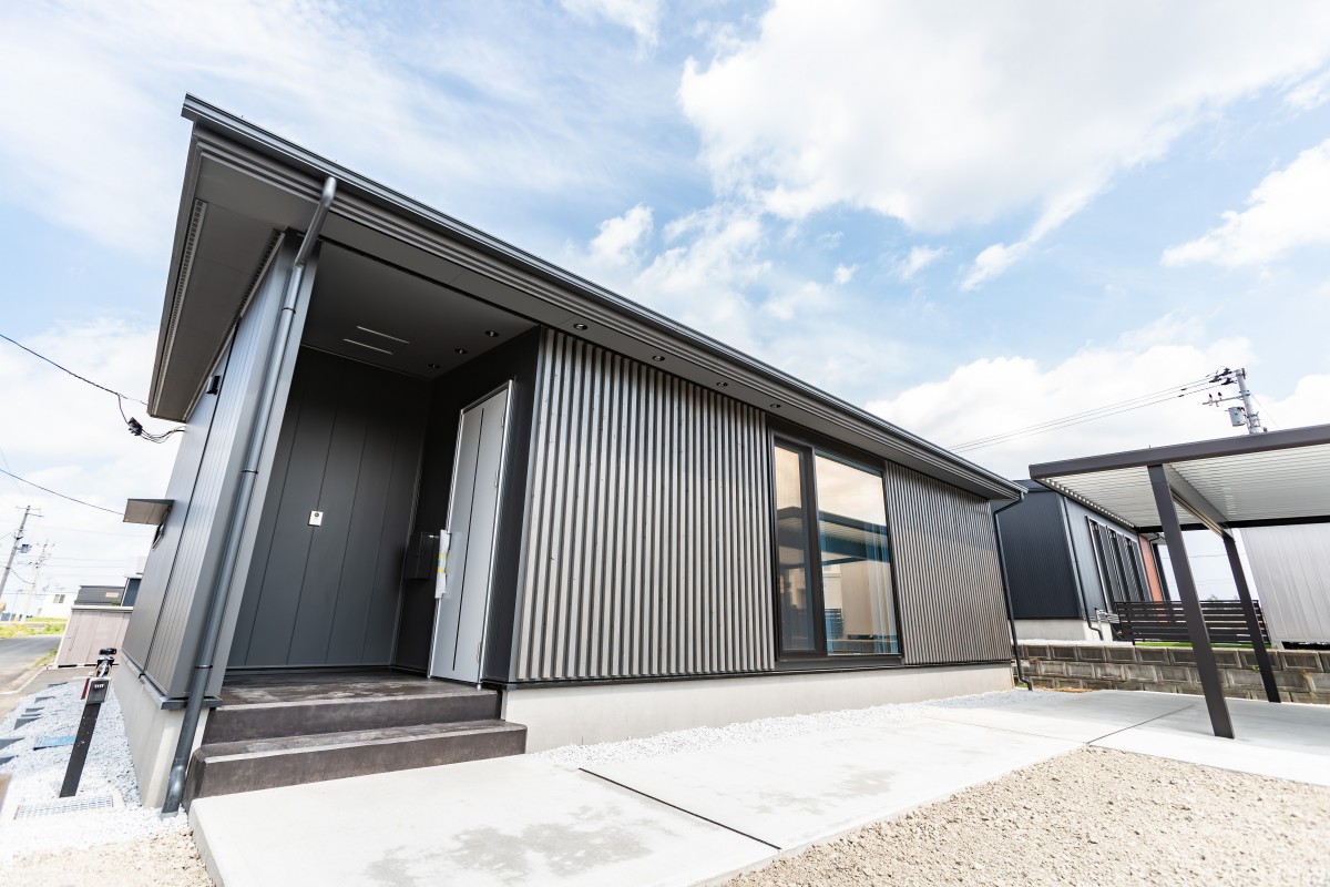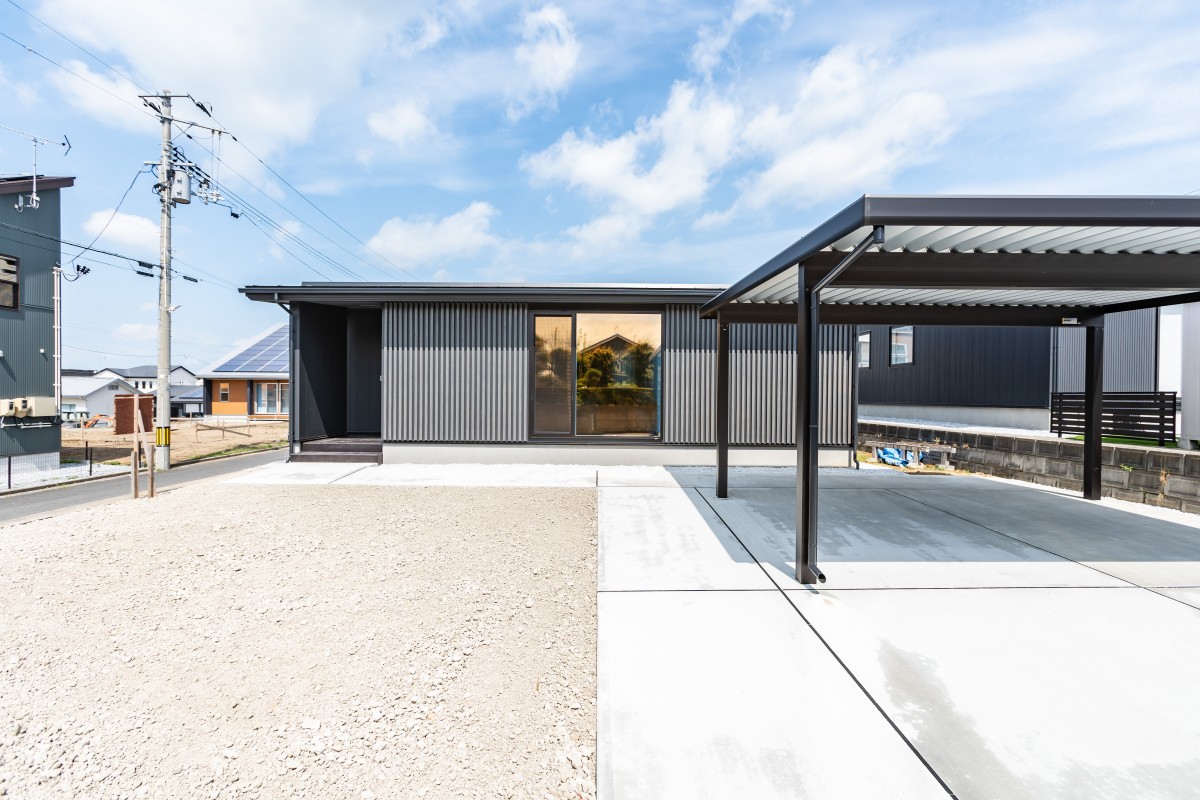 今回初の施工となりました「GALVALUME」。引き締まった黒い外観になじんだ木の格子がいい味を出しています。中は白を基調としたやわらかい雰囲気の内装で、大きな窓のある広いリビングでは、落ち着いた日常を過ごせそうです。
