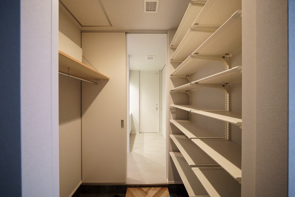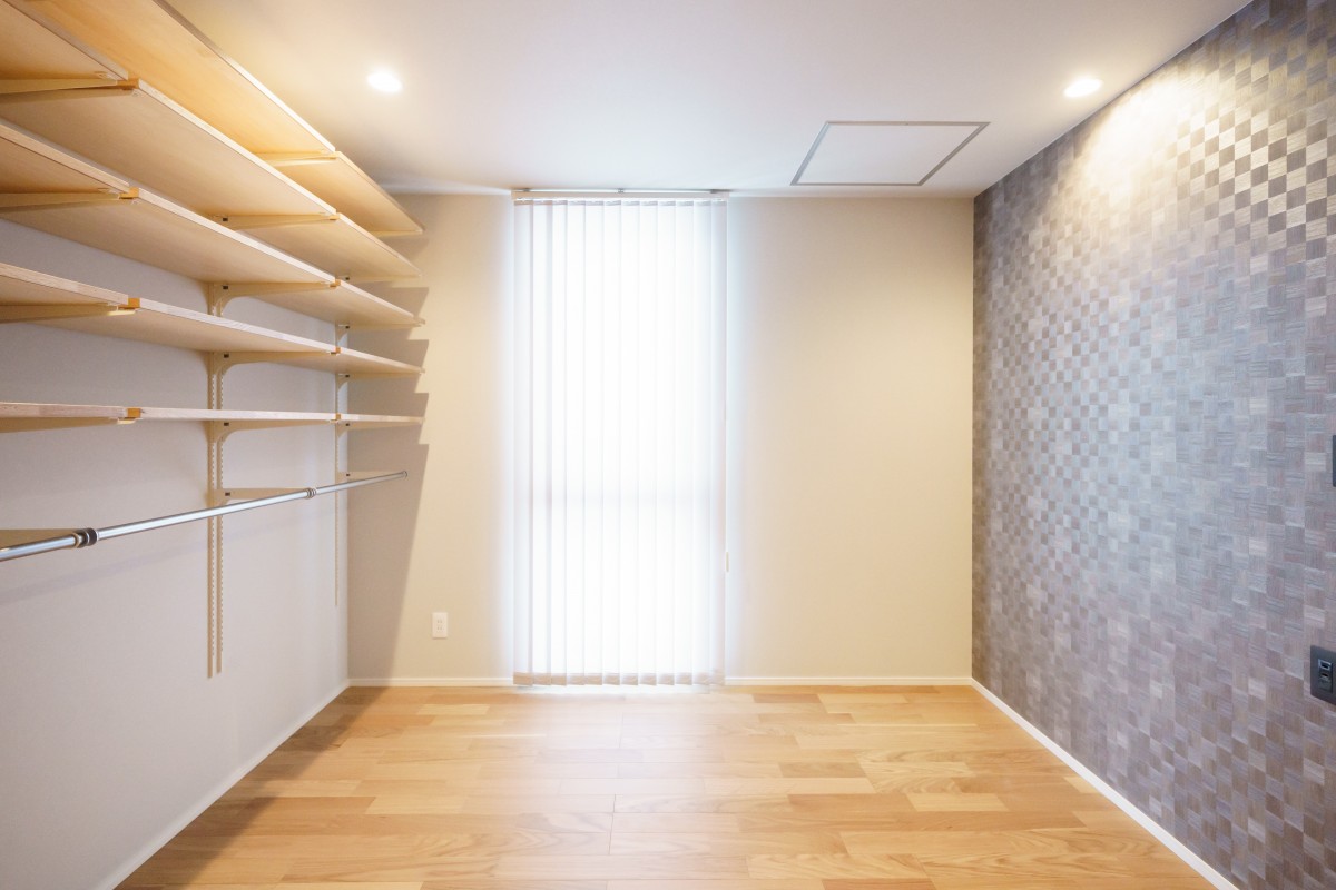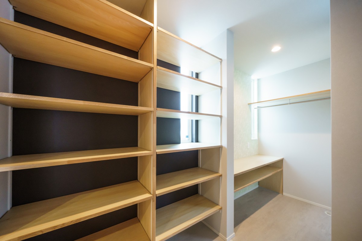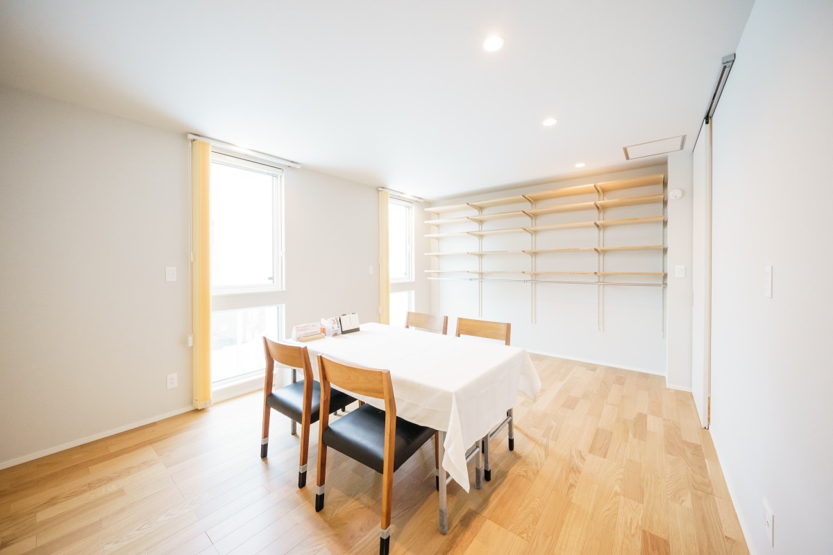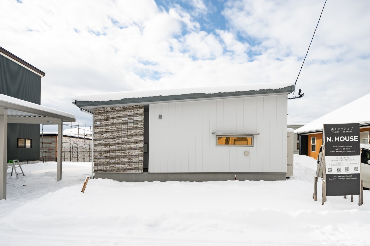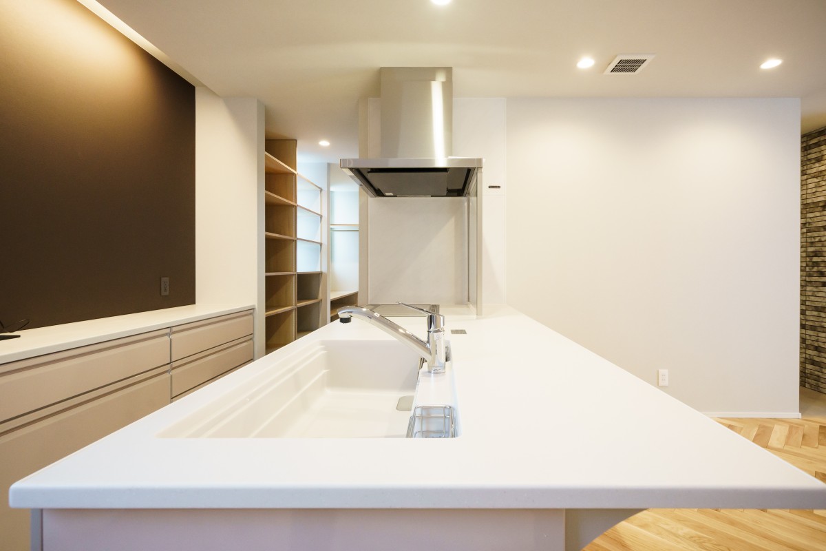 白の金属サイディングとタイルのバランスが丁度よく、華やかな外観に仕上がりました。中も広いリビングと、施主様のこだわりが詰まった豊富な収納棚、家事動線が熟慮された間取りで、デザイン・機能性・快適性を兼ね備えた素敵な1棟となりました。