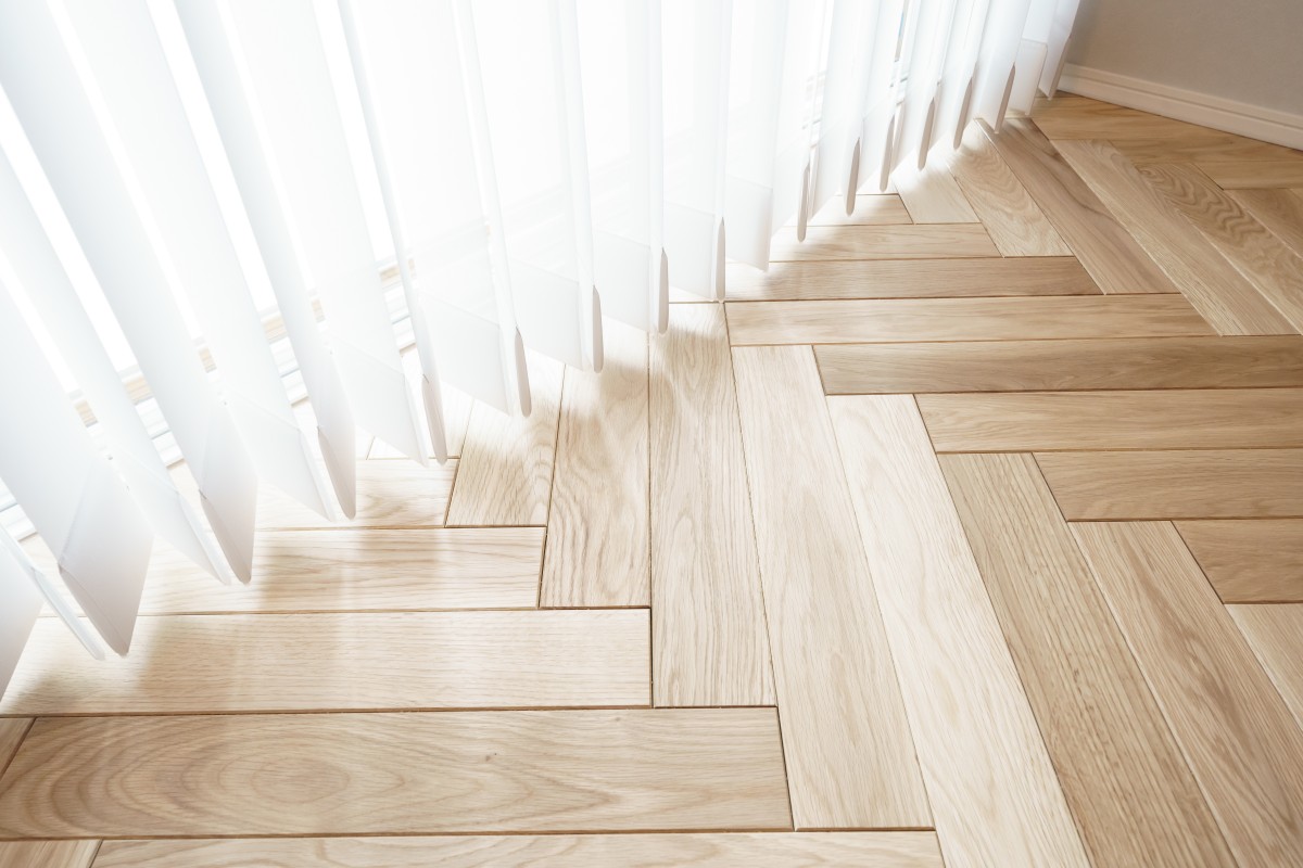 この床の張り方は「ヘリンボーン」という張り方で、開きにした魚の骨に似ているので、ニシンの骨という意味だそうです。リビングが19帖もあるので、張る枚数も膨大です。なかなか根気のいる繰り返し作業です。