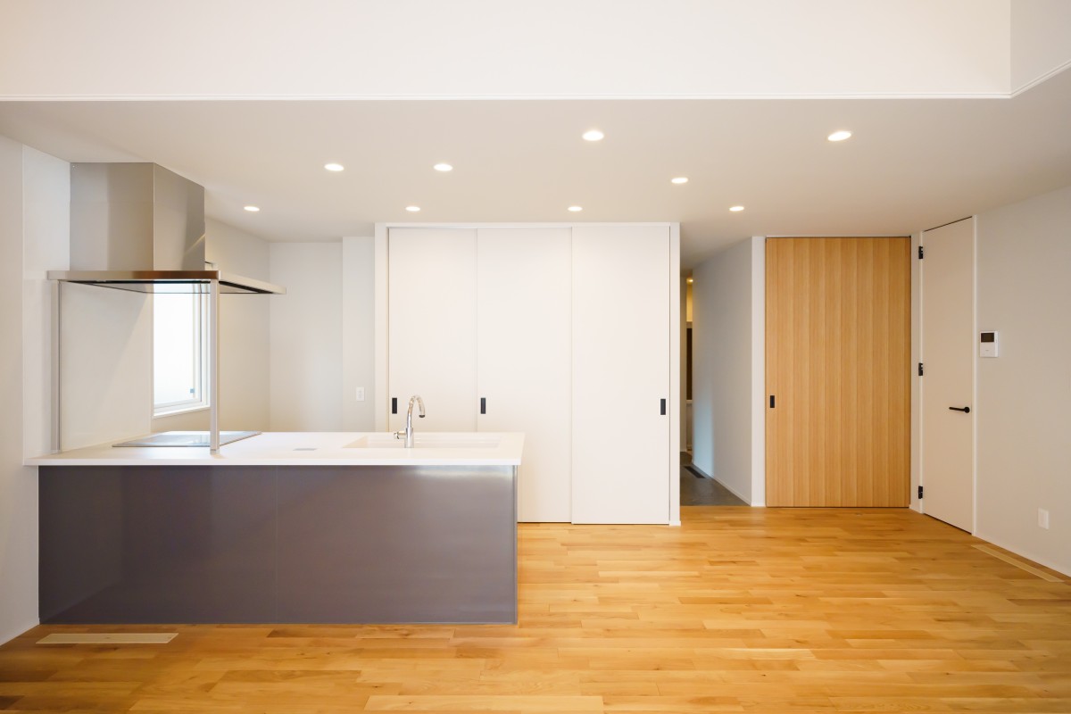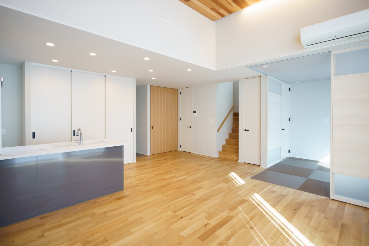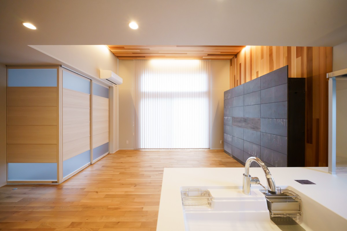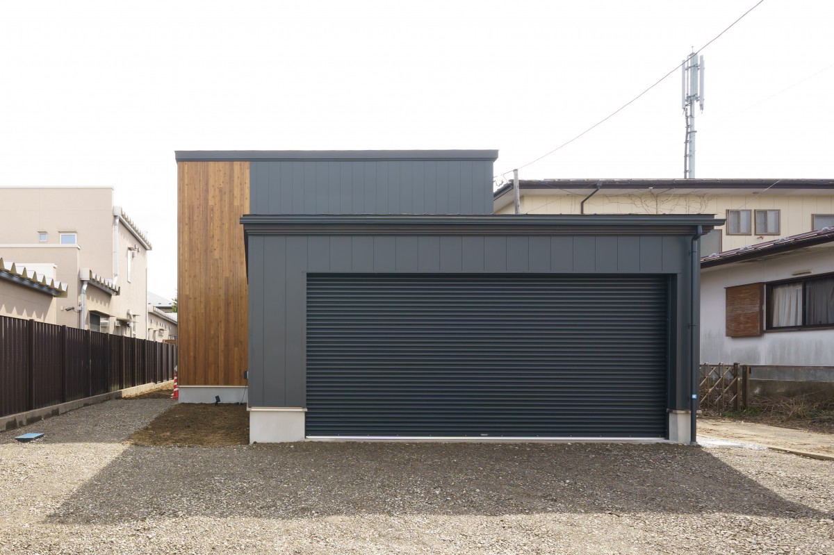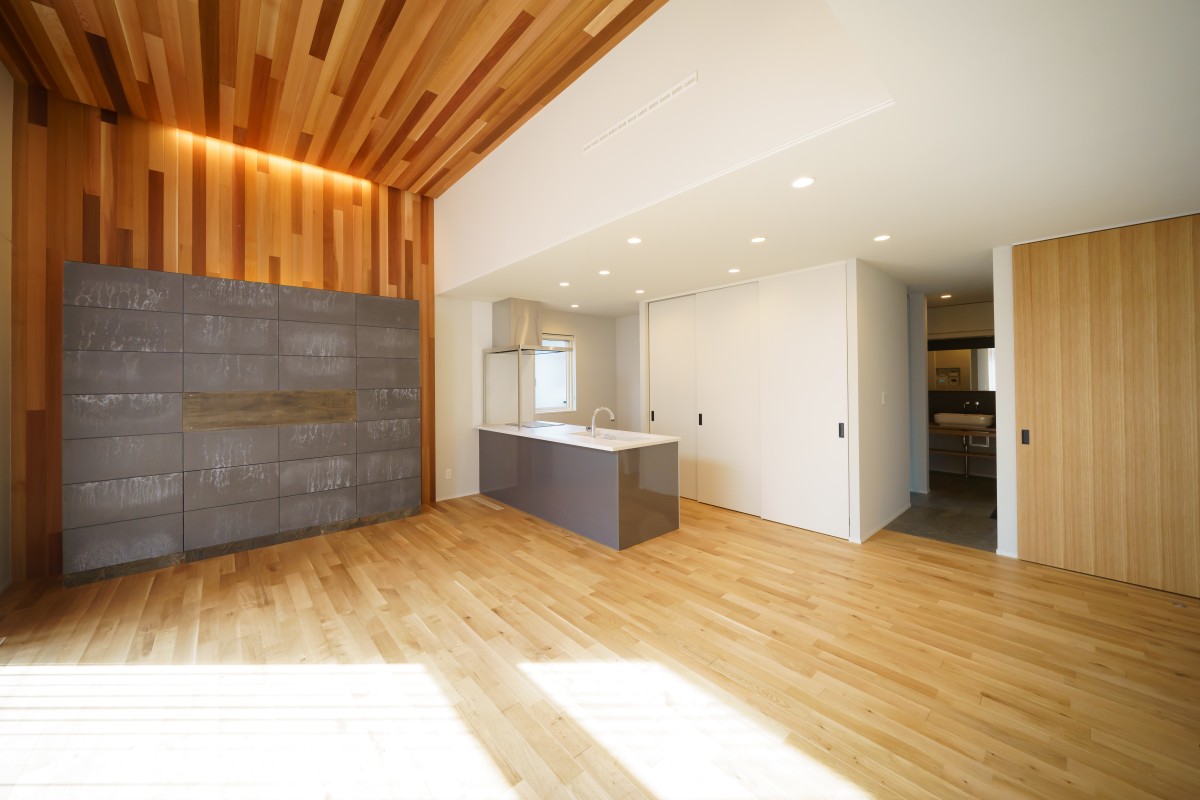 引き締まった黒い外観にアクセントの木目の壁が美しく、広々としたガレージには目を奪われます。そして内装にも木目の壁がふんだんに使われ、開放的なリビングには心があたたまります。きらびやかな住宅が完成しました。