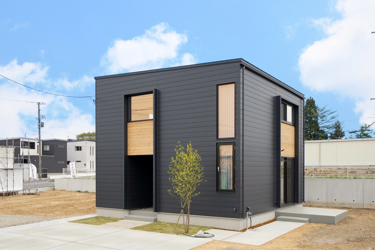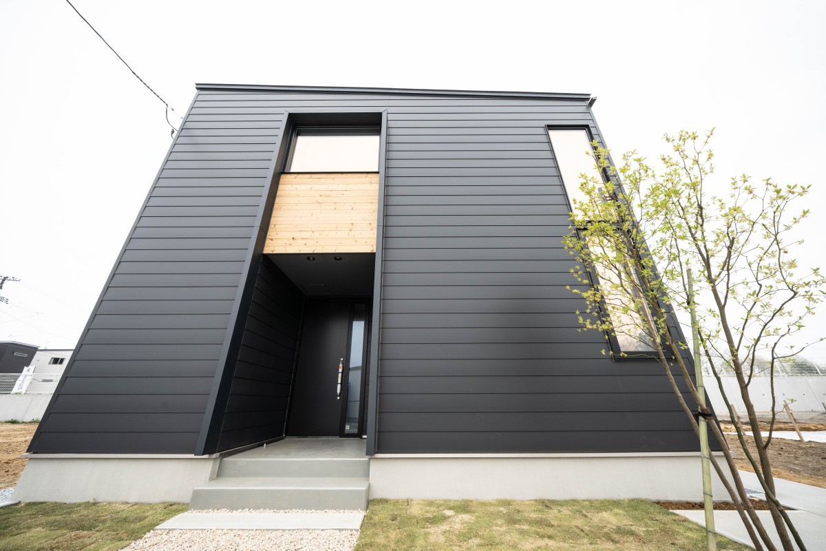 外装アクセントの木パネルは黒い外壁と相性バッチリ!