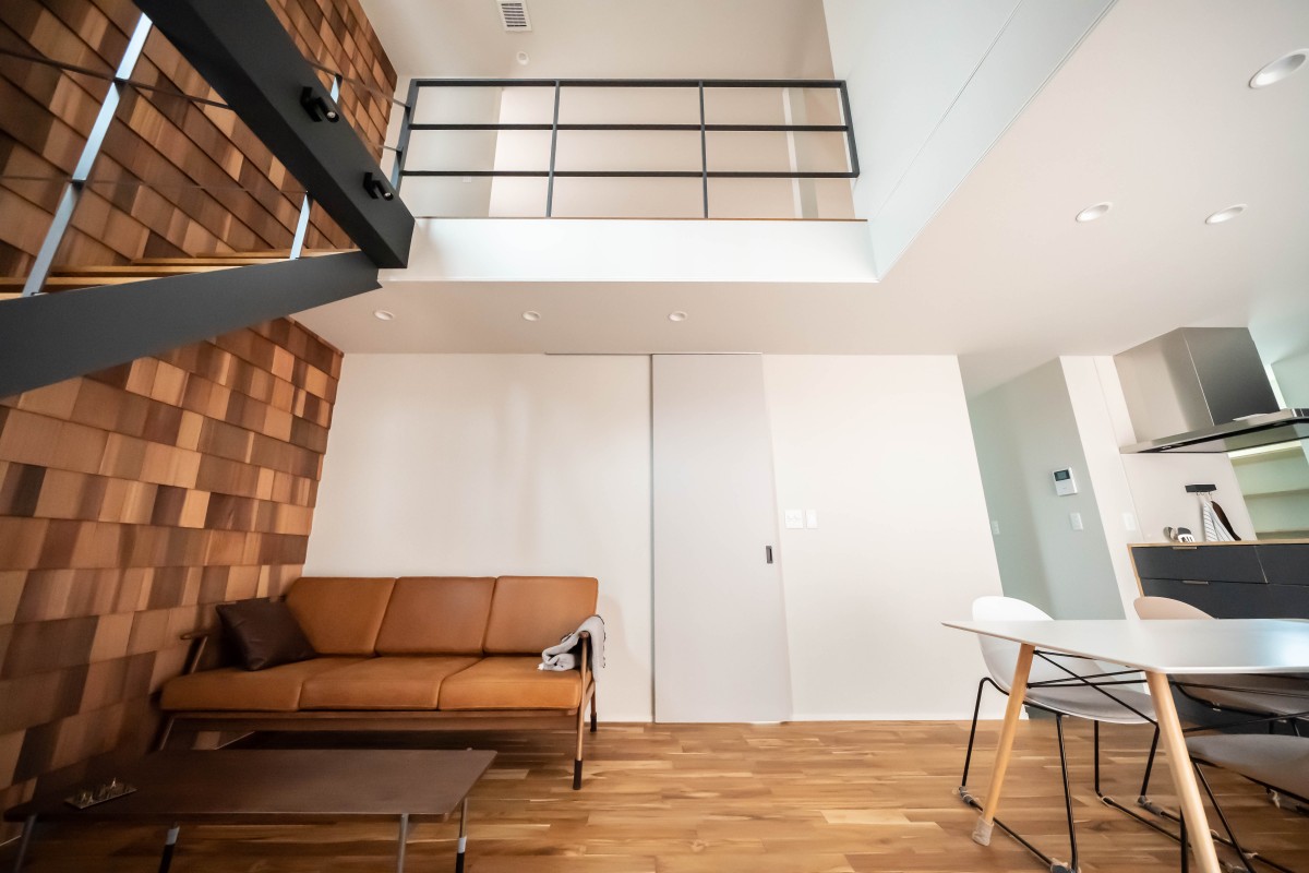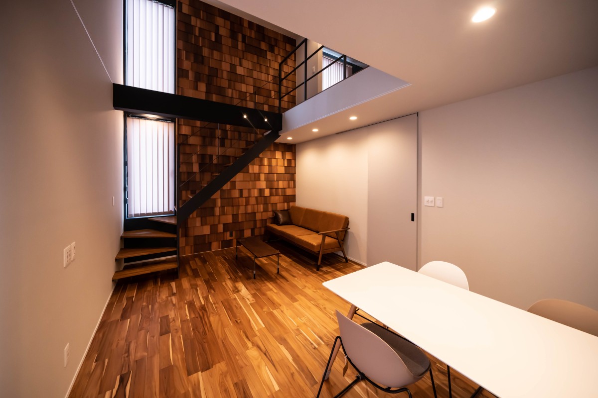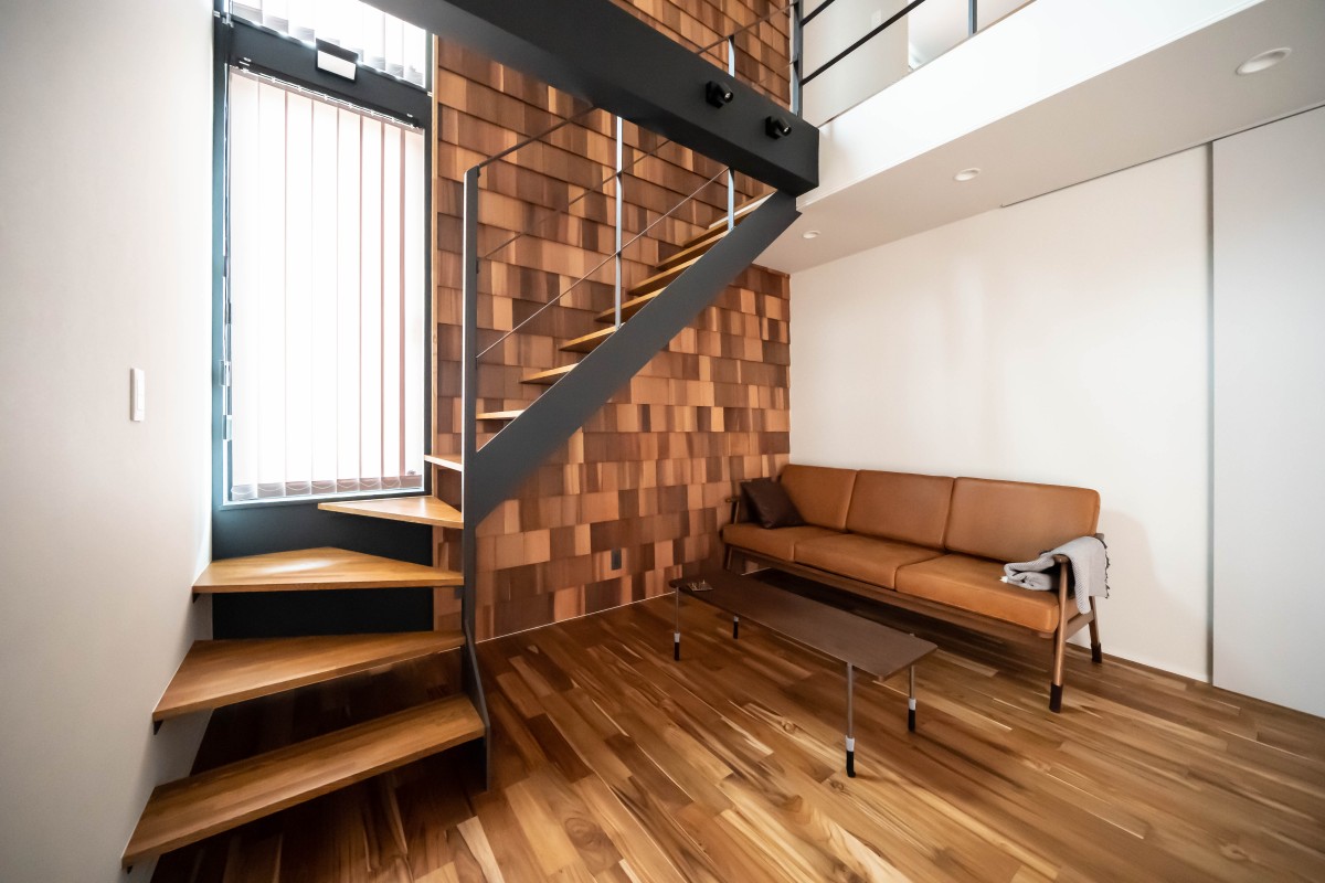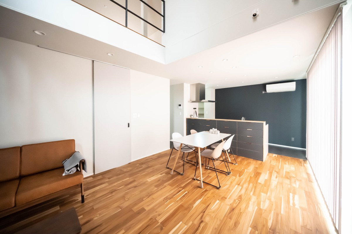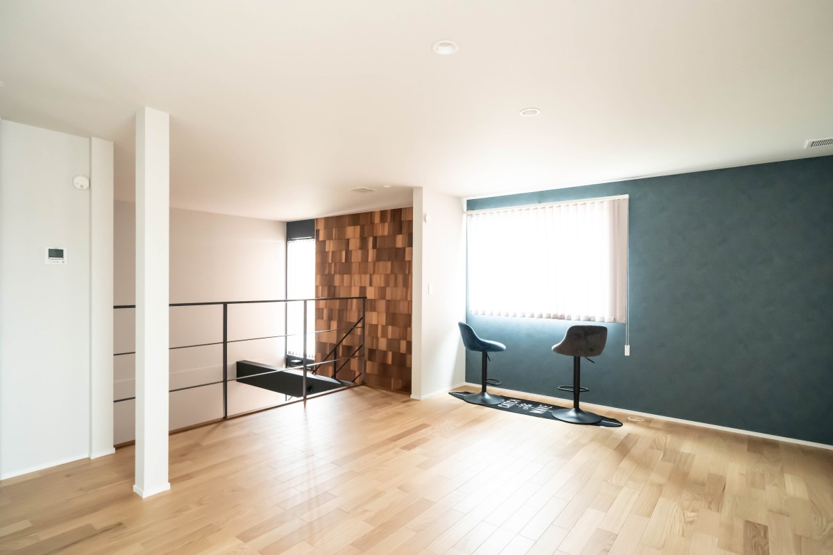 crasu+2階建ての完成です。開放感のある吹き抜けに面している木パネルの壁は迫力がありつつ、木のぬくもりも感じられ、心和むリビングです。こだわりの収納もいっぱいあり、暮らしやすさも兼ね備え、「安」「楽」「快」を家に装備するというコンセプトどおりの仕上がりとなりました。展示場として公開していますので、ご来場お待ちしております。