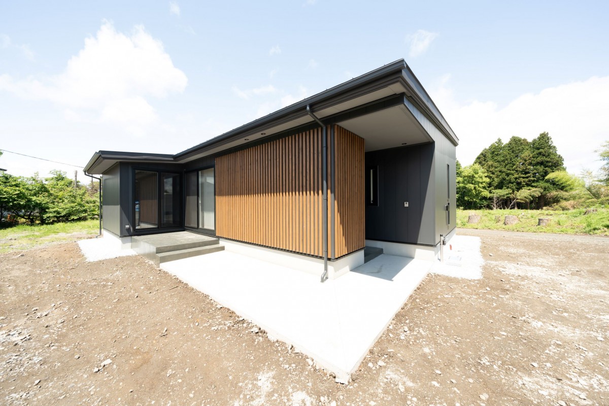 十和田市で着工したのはheritageの平屋です。黒い外観の中に、黄色みを帯びた茶色の木格子が映えるジャパニーズモダンデザインです。現場は順調に基礎工事が終わりました。