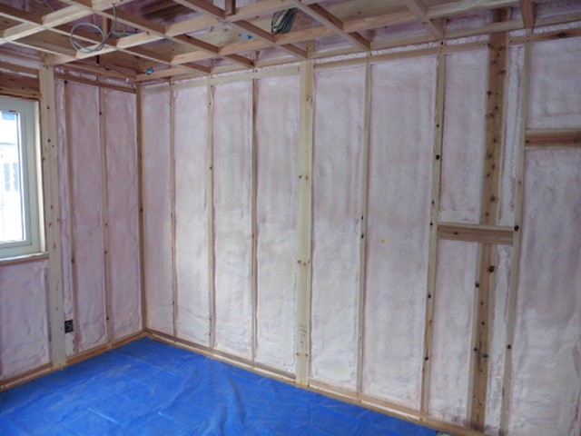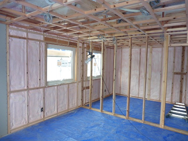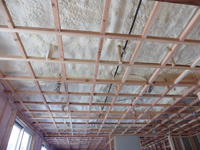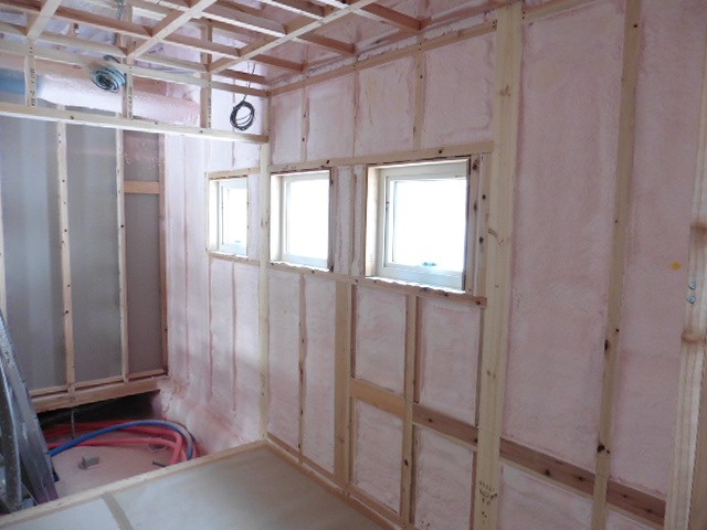 HOMAで採用している断熱材は吹付硬質ウレタンフォームです。ウレタンフォームの原液を発泡機で混合し、壁・天井に直接吹き付けて行きます。するとすぐに膨らんできて発砲スチロールのように固まります。吹付硬質ウレタンフォームは多くの材料と自己接着しますので複雑な構造物に対しても隙間の無い連続した断熱層を作ることができます。もちろん断熱性能は高く、無数の細かい気泡の中に、多量の空気を含んでいるため、ダウンジャケットやセーターと同じように、断熱性が高いのが特徴です。現場も寒くなってきましたが、室内の温度が外気温に影響を受けにくくなるので、中での作業もしやすくなります。