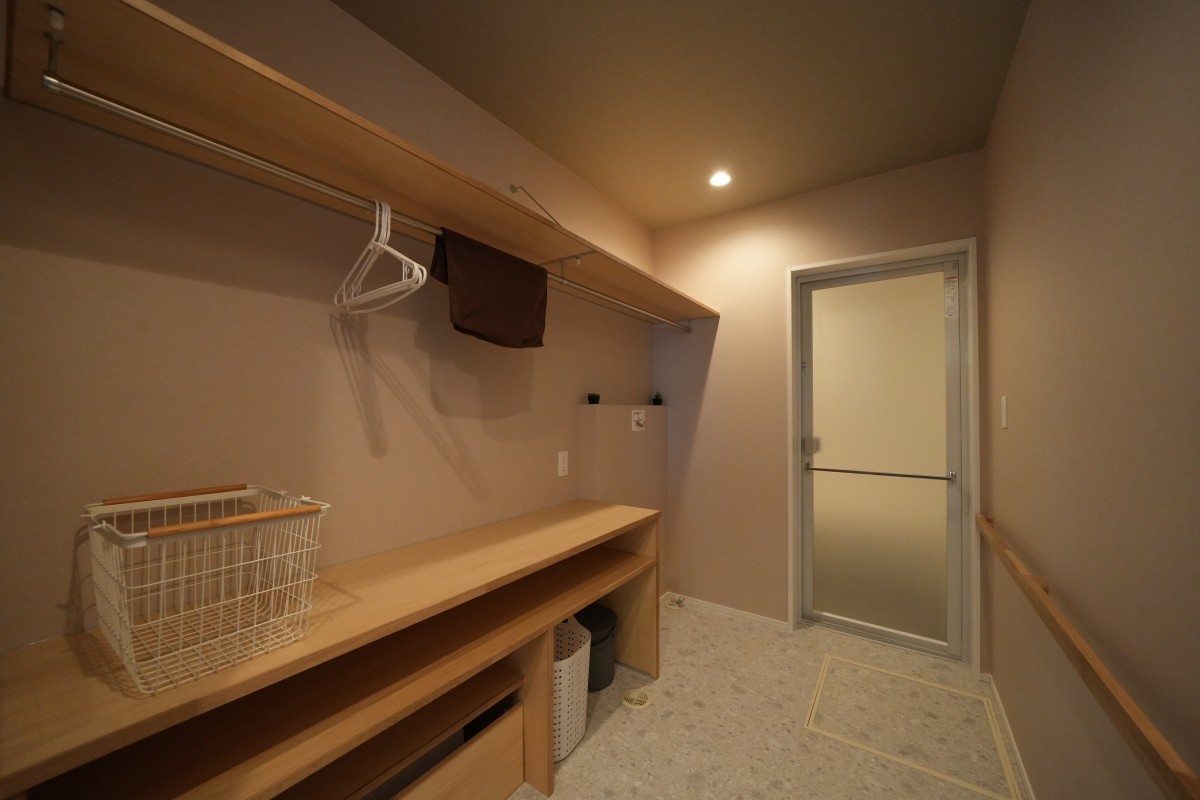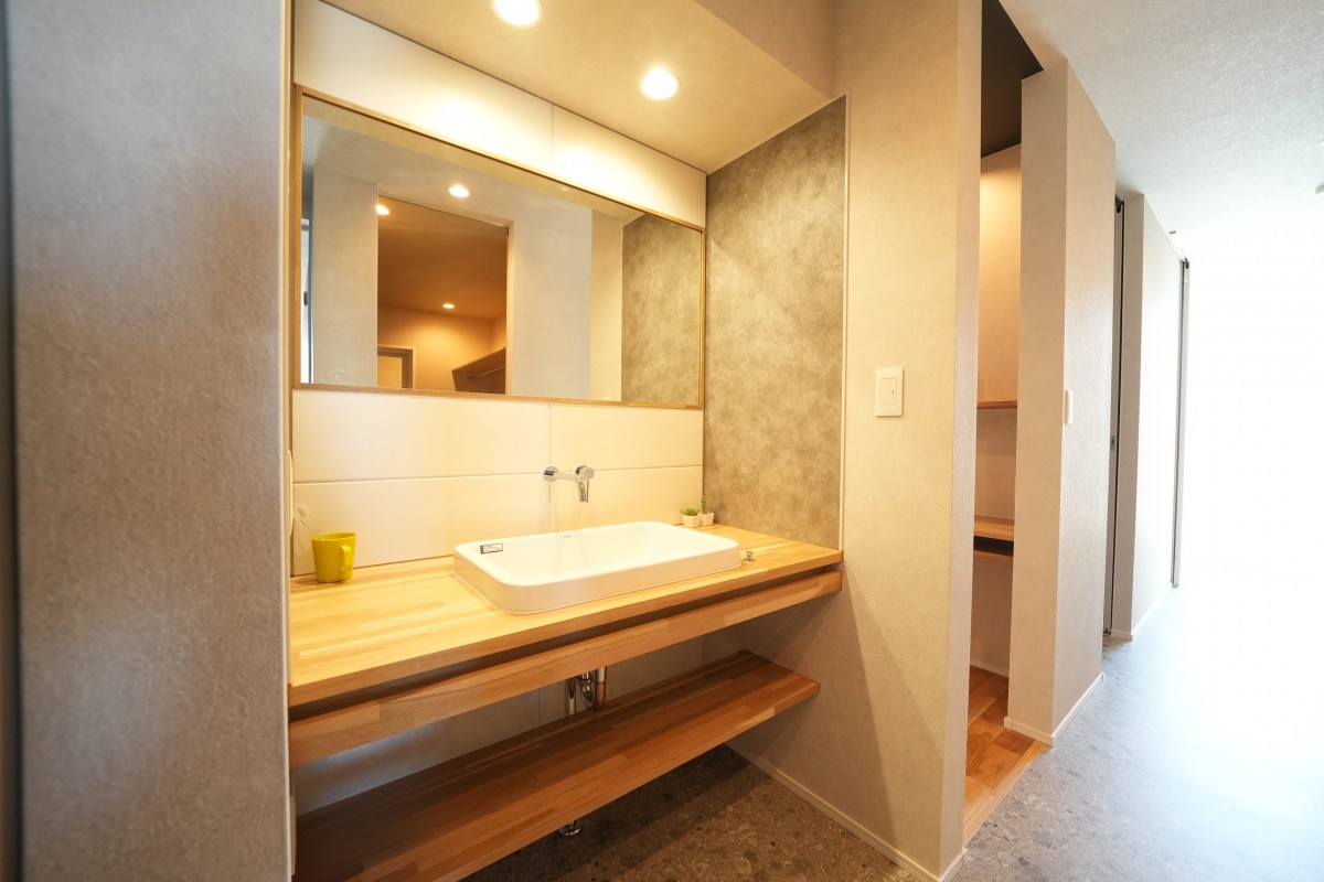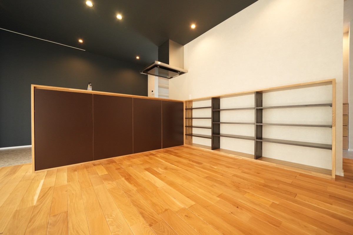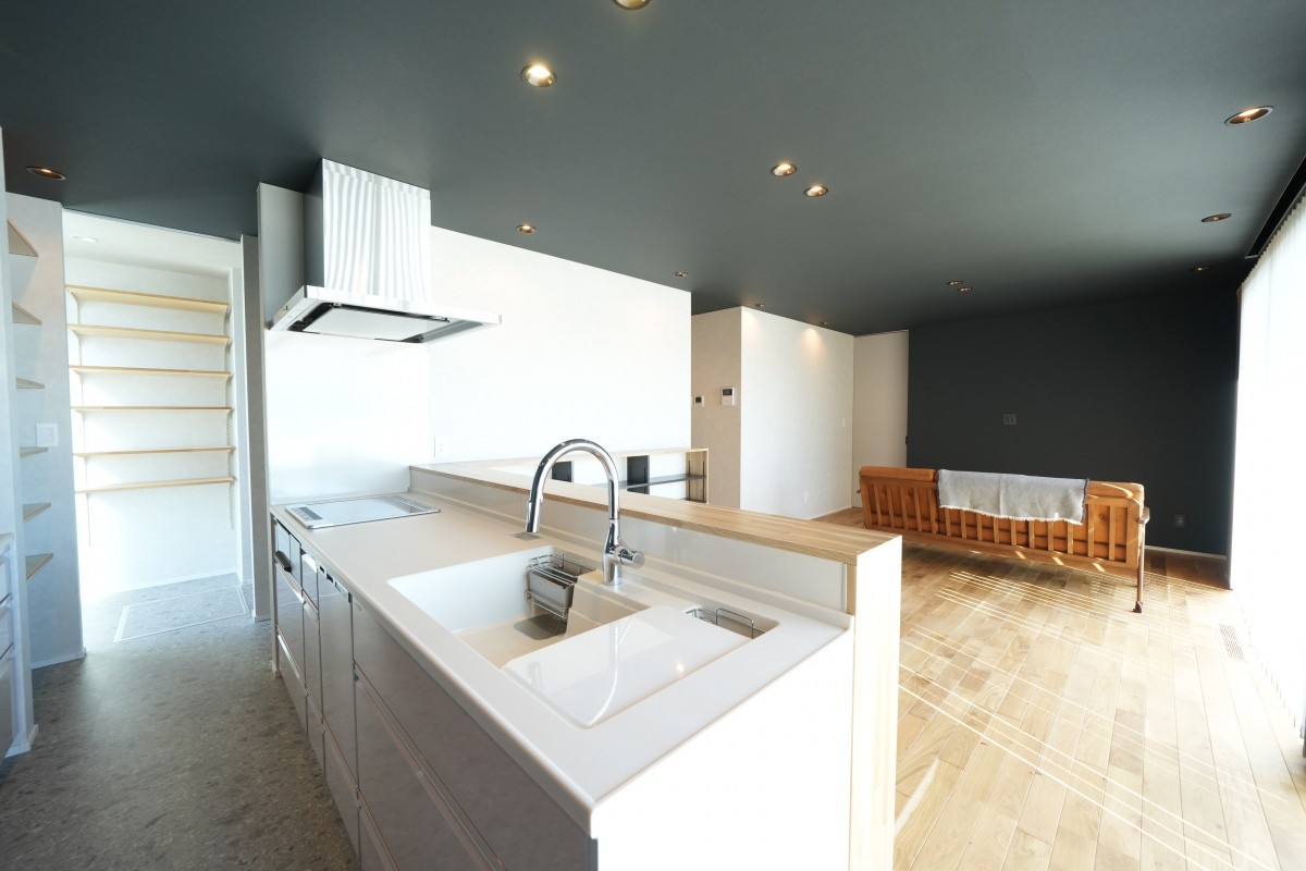 広いガレージと、日当たり良好の広りリビングの前には広いテラス。そして寝室が3部屋もあり、すべてを盛り込んだと言ってもいいくらいの平屋の完成です。部屋のあちこちにある造作棚は、見栄え、使いやすさ、収納力を備えて、素晴らしい仕上がりになりました。外観も白い塗り壁とのツートンカラーで、ビシッと引き締まった印象になり、良い仕上がりとなりました。平屋でこの間取りはなかなかいいです!