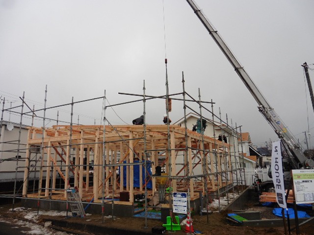 建方が終わりました。今では柱や梁などの木材が事前に図面通りの長さや太さでカットされて現場に運ばれてくるので、現場で木材を加工することなく組んでいけます。よって高精度に早く建物の骨組みを組み建てることが出来ます。木材同士の接続部には金物が埋め込まれていて、ドリフトピンというピンを指して固定していきます。この工法は従来の在来軸組工法で行われていた、木材の掘り込み(断面欠損)を最小限に抑えることができるので、木材の強度を落とさずに組んでいけます。それ以外にもたくさんの長所がありますので詳しくはこちらへ