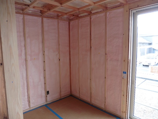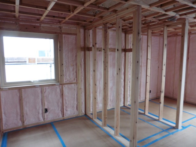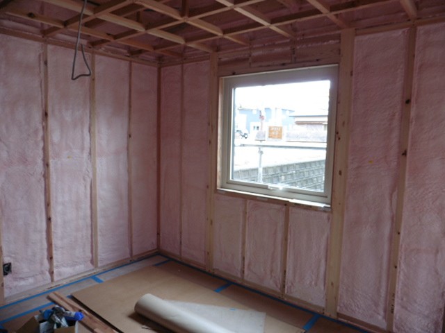 窓が設置され、断熱工事も終わりました。ピンク色で柱と柱の間に敷き詰められているのが吹硬質ウレタンフォームという断熱材です。吹付硬質ウレタンフォームは現場で壁に直接ウレタンフォームの原液を吹き付けて発泡させるので、隙間のない気密性の高い断熱層を作ることができます。現場は寒さの厳しい冬真っただ中ですが、この断熱工事が終わると室内はだいぶ過ごしやすく作業もしやすくなります。断熱工事を施工前と施工後ではこんなにも違うのかと、断熱材の性能の良さを実感します。