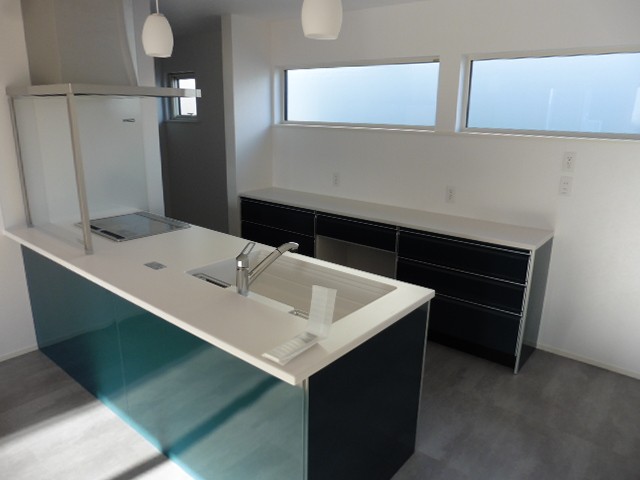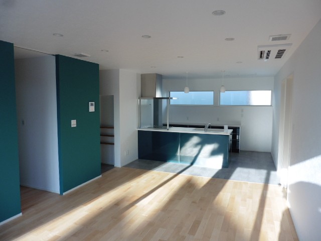 完成しました。今回六戸町で完成したのはforesta(フォレスタ)の平屋です。シンプルな緑色の壁紙と同色のキッチンがある広いLDKには大きな窓があり、日当たりもよく暖かそうです。LDKの床は無垢の床材でメープルというカエデの木の床材です。色が白っっぽいのが特徴なので、部屋がより明るく見えます。また、洋室が3部屋もあるので、平屋でも狭く感じません。洋室に挟まれた共用のウォークインクローゼットは、子供の成長に合わせたりして、使うスペースをいろいろ変えられるので便利です。平屋もいいなあと実感する仕上がりです。