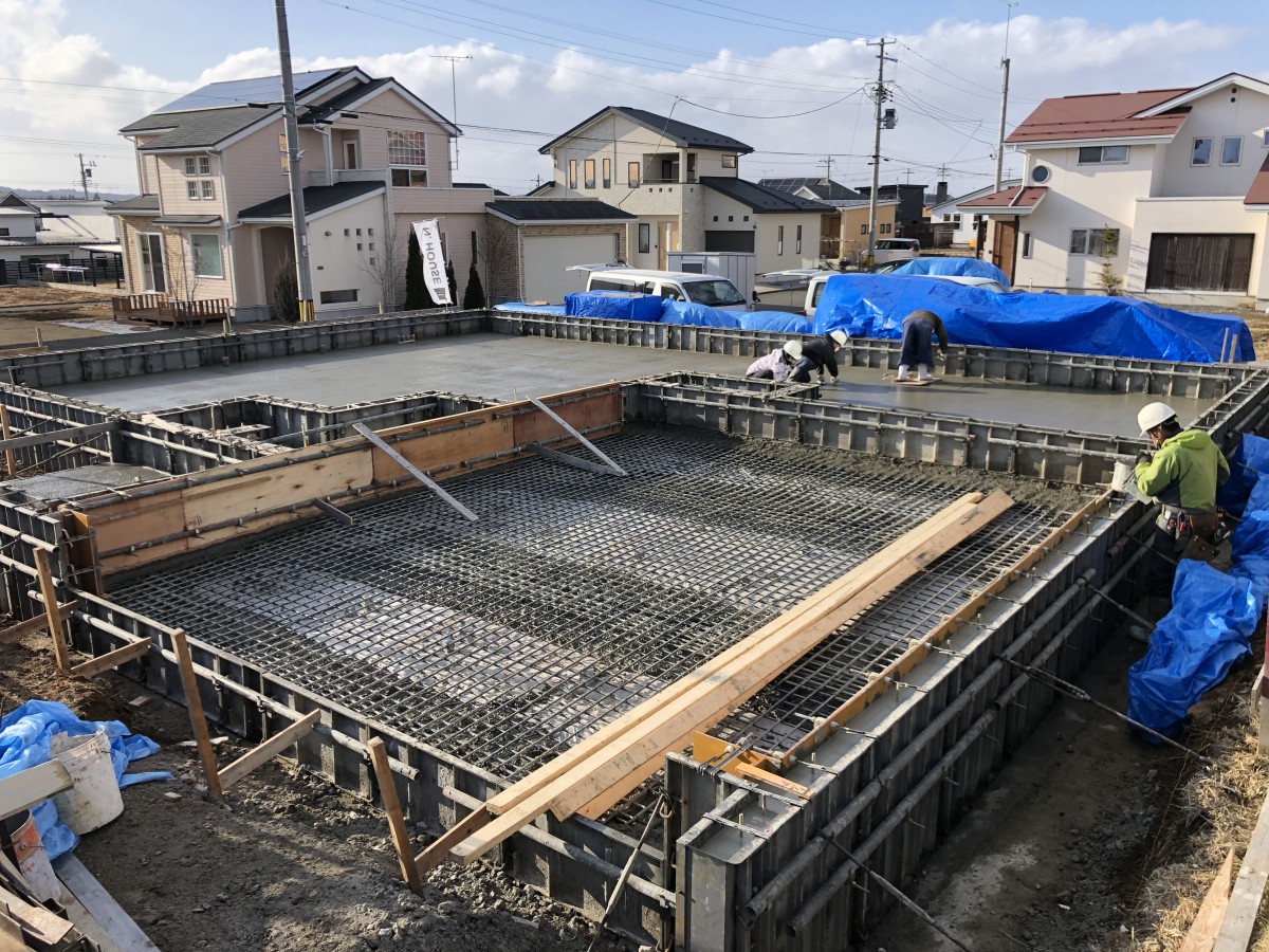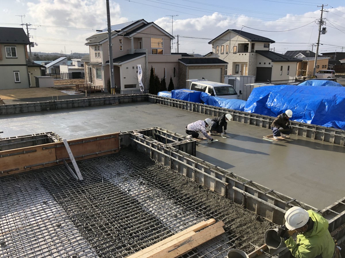 ただいま基礎工事が進行中です。基礎の配筋が終わり、基礎の底盤部のコンクリートを打設を行いました。打設したコンクリートがある程度固まってから、コンクリートの上に直接乗って綺麗に平に均していきます。すべて同じ高さになるように、隣で均している人と同じ高さになるように連携して均していきます。まさに職人達のなせる技です。
