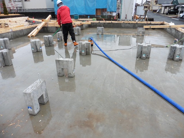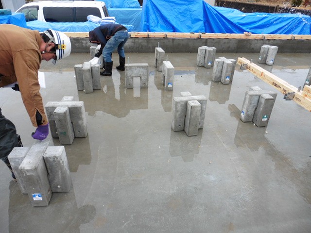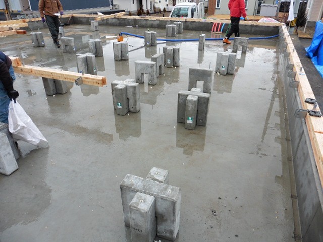 基礎工事が終わりました。弊社で採用している基礎は耐圧盤式グリッドポスト基礎工法です。内部立上りの基礎梁に変わって、工場で作ったコンクリートブロックを設置することで施工性の向上及び工期短縮を図ります。仕切られない床下空間が実現できる為、床下の空気循環性が向上し、結露によるカビの発生や、土台の腐朽を防ぐことができ、耐久性にも優れています。見るからに仕切りがない分床下の空気の循環は良さそうです。