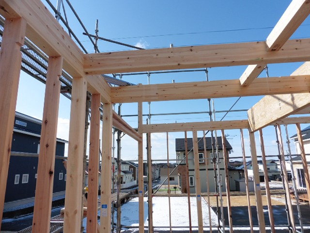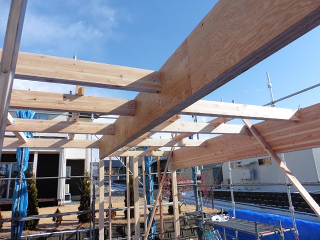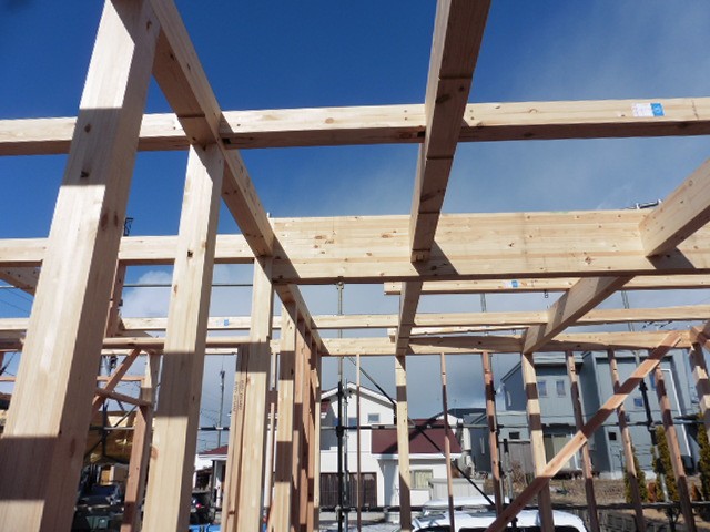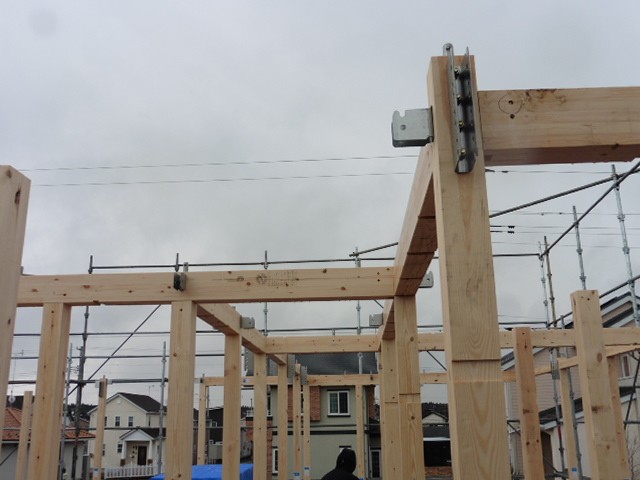 建方が終わりました。今では図面通りの寸法にカットされた木材が現場に運ばれて来て、さらに木材の中に接続する金物が埋め込まれているため、柱や梁を組むのが簡単になりました。非常にスピーディーであっというまに屋根までかかります。早いだけではなく、施工精度も非常によく、木材の継手のための掘り込みも少ないので、木材の強度を落とすことなく組めるので耐震性にも優れています。金物工法をさらに詳しくはこちら【耐震性能:金物工法】