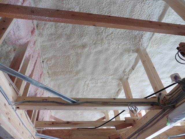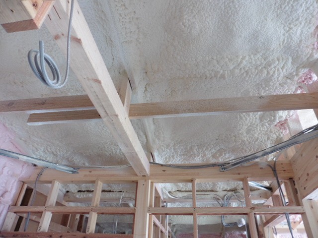 壁・天井の断熱工事が終わりました。弊社で採用している断熱材は吹付硬質ウレタンフォームです。厚みを取りやすい天井は性能は多少落ちるが安価な白い色のウレタンフォームで200mmの厚さで施工。厚みが取りづらい壁は、天井のものよりは高価だが性能の良いピンク色のウレタンフォームを75mmの厚さで施工しています。断熱性能の良いものを分厚く施工出来れば理想的なんですが、コスト面もしっかり考慮し、適材適所で費用対効果が良いもの厳選し、2種類のウレタンフォームを使い分けています。