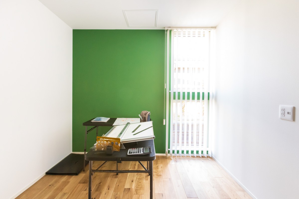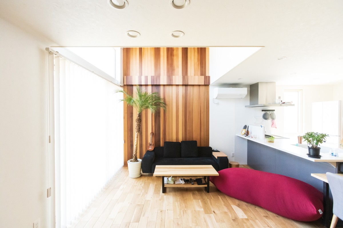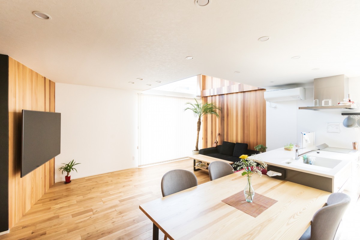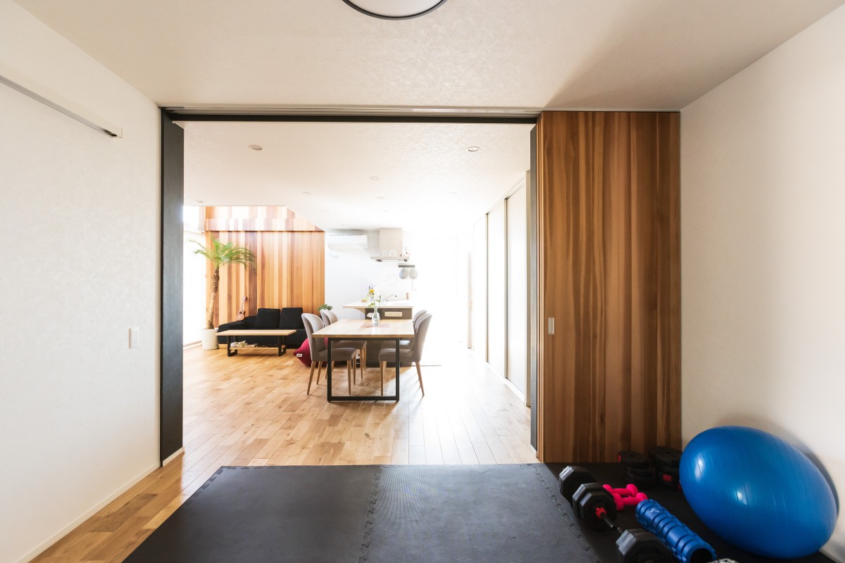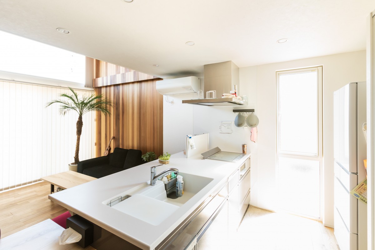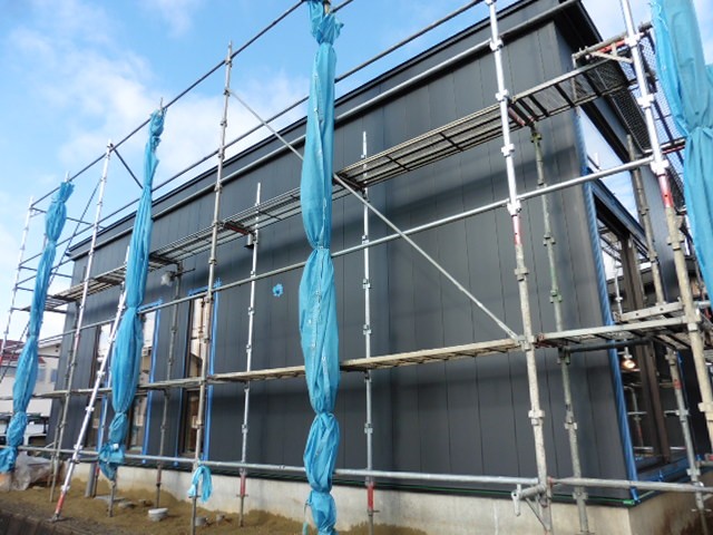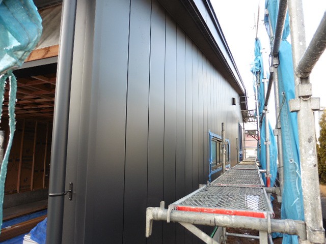外壁貼りが終わりました。外壁は黒いシンプルな金属の外壁です。金属なのでツルっとした質感で、表面にはフッ素樹脂塗装が施されているので、汚れが付きにくく、黒なのでさらに汚れが目立たなく、いつまでもキレイな状態を維持できます。フッ素樹脂塗装には遮熱効果もあり、夏のきびしい日射を反射してくれるので、外壁から室内に伝わる熱を低減します。さらに厚さ15ミリという薄さにもかかわらず、中に断熱材が入っているので、夏も冬も快適に過ごせる優れものです。