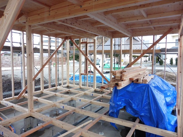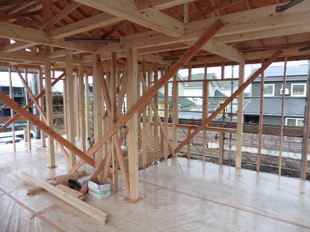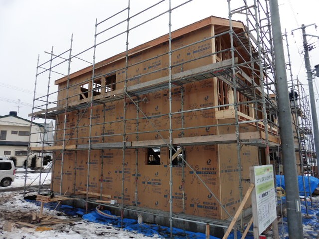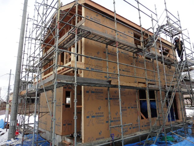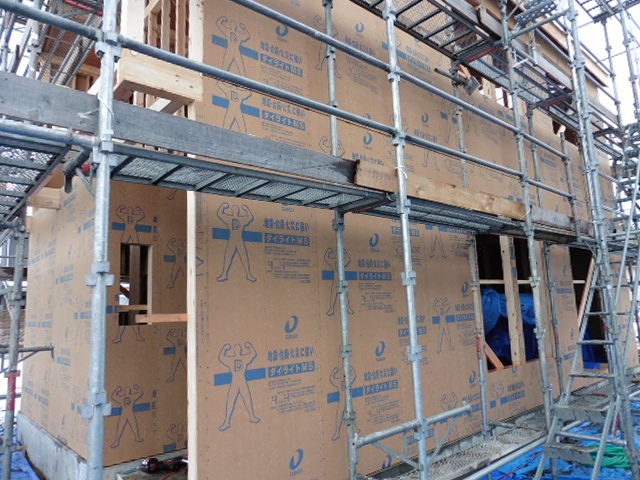 そして外部耐力壁面材貼りも終わりました。建物の外側に貼られている薄い茶色い壁が耐力壁面材です。地震や風などの横からの力から家を守ってくれます。それだけでなく火災にも強く、湿気を通しやすいのです。家の中では炊事や家事で水蒸気が発生します。室内で発生した暖かく湿った空気は、小さな隙間から壁の内部に侵入し、外壁側の冷たい空気で冷やされ、外壁部分の壁内で結露を引き起こすことがあります。この水分が大切な柱や土台といった構造躯体を腐らせる原因となります。しかし弊社が採用している外部耐力壁面材のダイライトは湿気を通しやすいので、外壁部分で結露を起こすことなく湿気を逃がしてくれます。外壁の中にすぐ隠れてしまう外部耐力壁面材ですが、優れた性能で家を守ってくれています。
