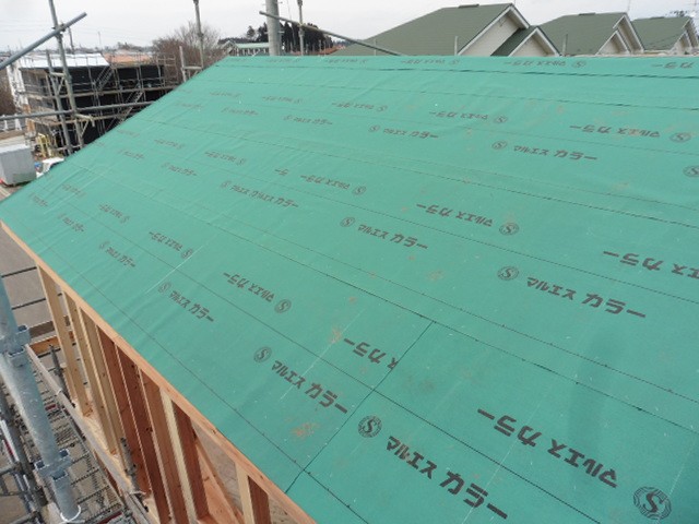 建方が終わり、屋根のアスファルトルーフィング貼りも終わりました。屋根の上に貼っている緑色のシートがアスファルトルーフィングです。雨漏りしないように雨から家を守ってくれる防水材です。この上から屋根材が貼られます。