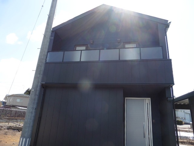 外壁貼りが終わりました。6mもの長さの金属の外壁を上下に分かれて二人で貼っていきます。しかも端部を屋根の勾配なりにカットしてから貼ります。しかもすべて違う長さにカットしなければならないので、1枚貼ったら、次貼る外壁の長さを測り、カットして貼る。その繰り返しです。よって、貼る人とカットする人に分かれての作業です。うまく連携しなければ、はかどらない作業です。使用している金属の外壁は軽いのが特徴です。作業する人の負担も少なくて済みます。軽いと地震のときの負荷が少ないので、耐震にも有効です。
