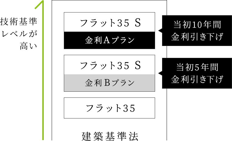 【フラット 35】には技術者基準レベルに応じて3種類のプランがあり、当社で建設する住宅の標準仕様は、その中の【フラット35】S(金利Aプラン)に該当しています。