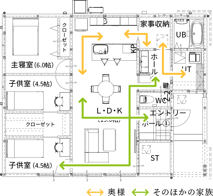 朝、帰宅時、夕食、就寝まで、休日等の日常生活のシチュエーションでストレスのない動線を実現させることが重要です。