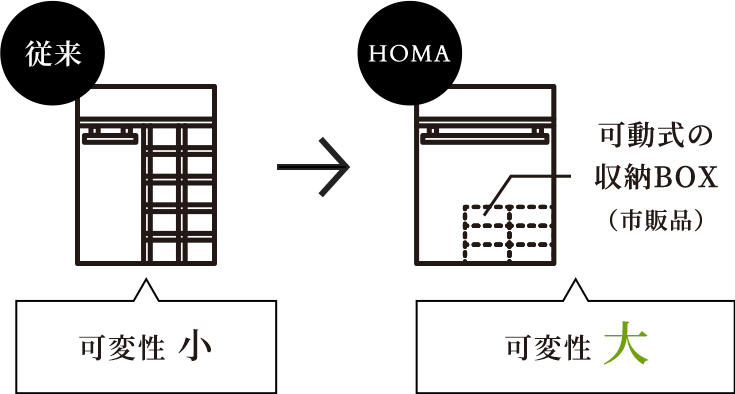 収納内の棚も、スケルトン・インフィルの「インフィル」と捉え、可変性を持たせるべきです。